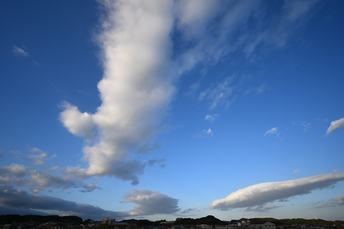 | ゆるやかな西高東低気圧配置の晴天。 11月も下旬になって、おだやかな冬の日のような空でした。 冬の積雲列が地形性の雲の性質を帯びているようです。 山麓や東方にそうした雲がたくさん見えている中、 頭上にも湧き出すようにそうした雲が現れました。 |