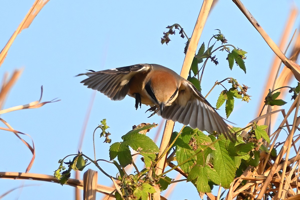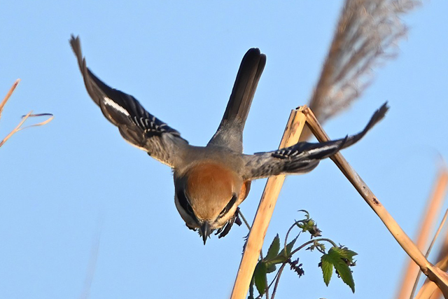 夕方、員弁川の中州にて。 カワセミは飛翔通過のみでしたが、川岸のモズがバッタを捕食する シーンと、ハシブトガラスがコイを食べるシーンを撮影できました。 |