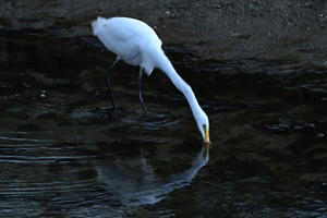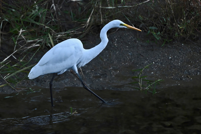 1羽のダイサギが川岸沿いの浅瀬を歩いてきました。