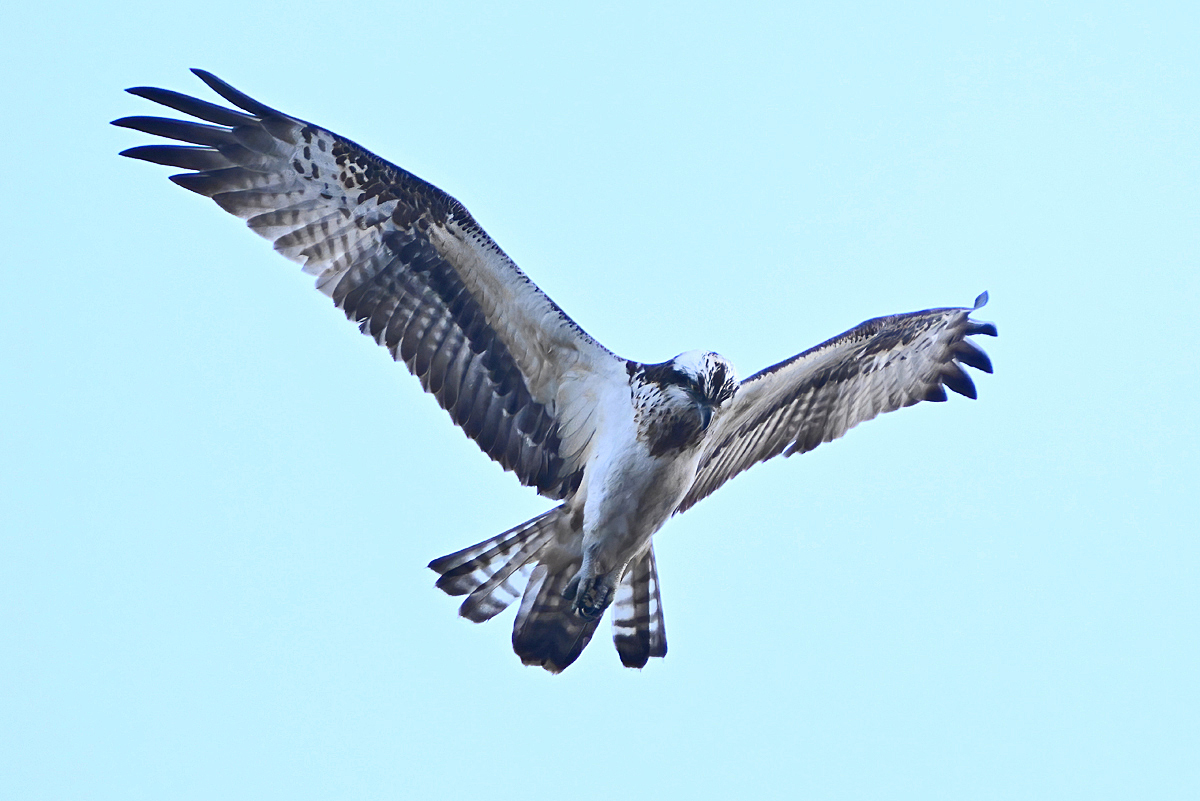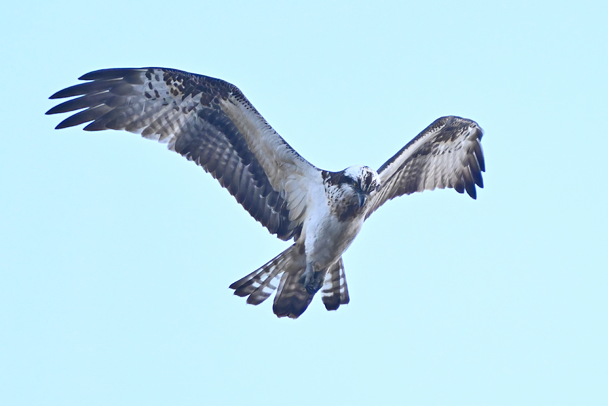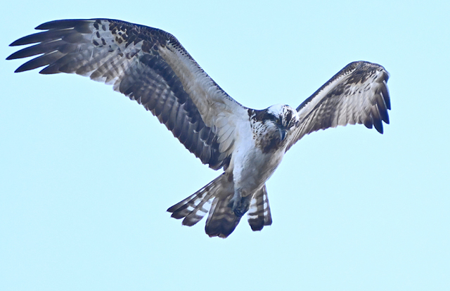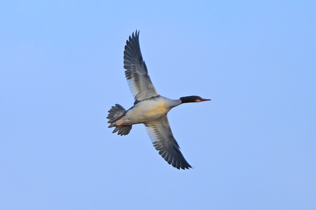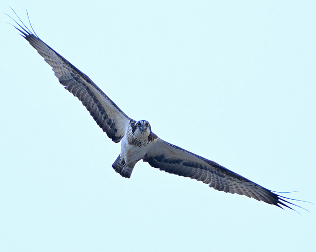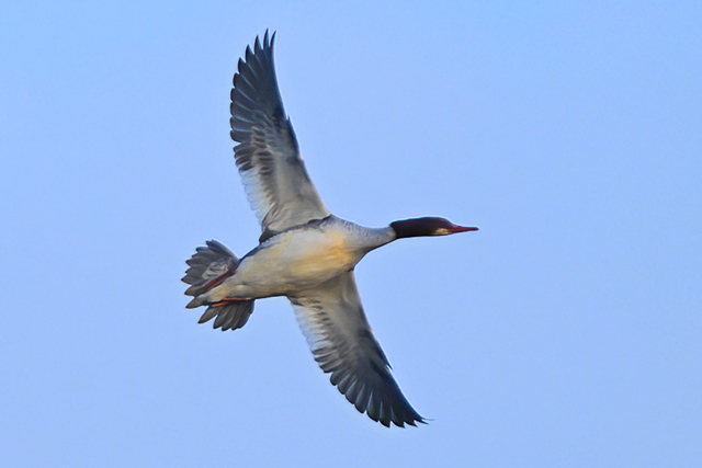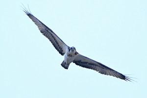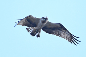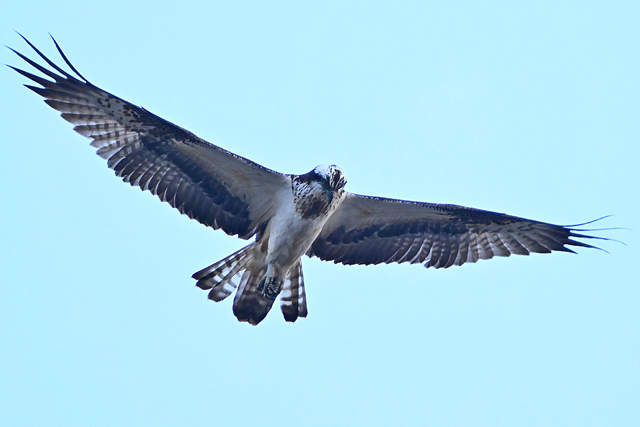 夕方、員弁川の中州にて。 カワセミは飛翔通過のみ。 ミサゴが下流から向かい風を受けてゆっくりと飛んできました。 光線状態はいまひとつながら、大きく撮影。 カワアイサ♀が1羽、下流からこちらに向かって来て、 ぐんと旋回して引き返していきました。 |