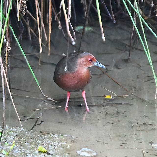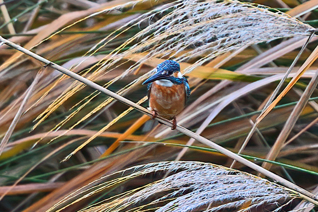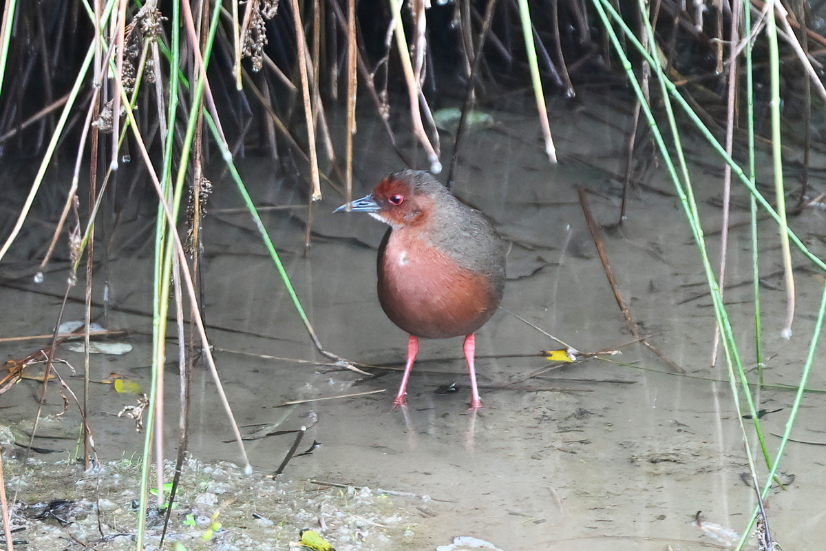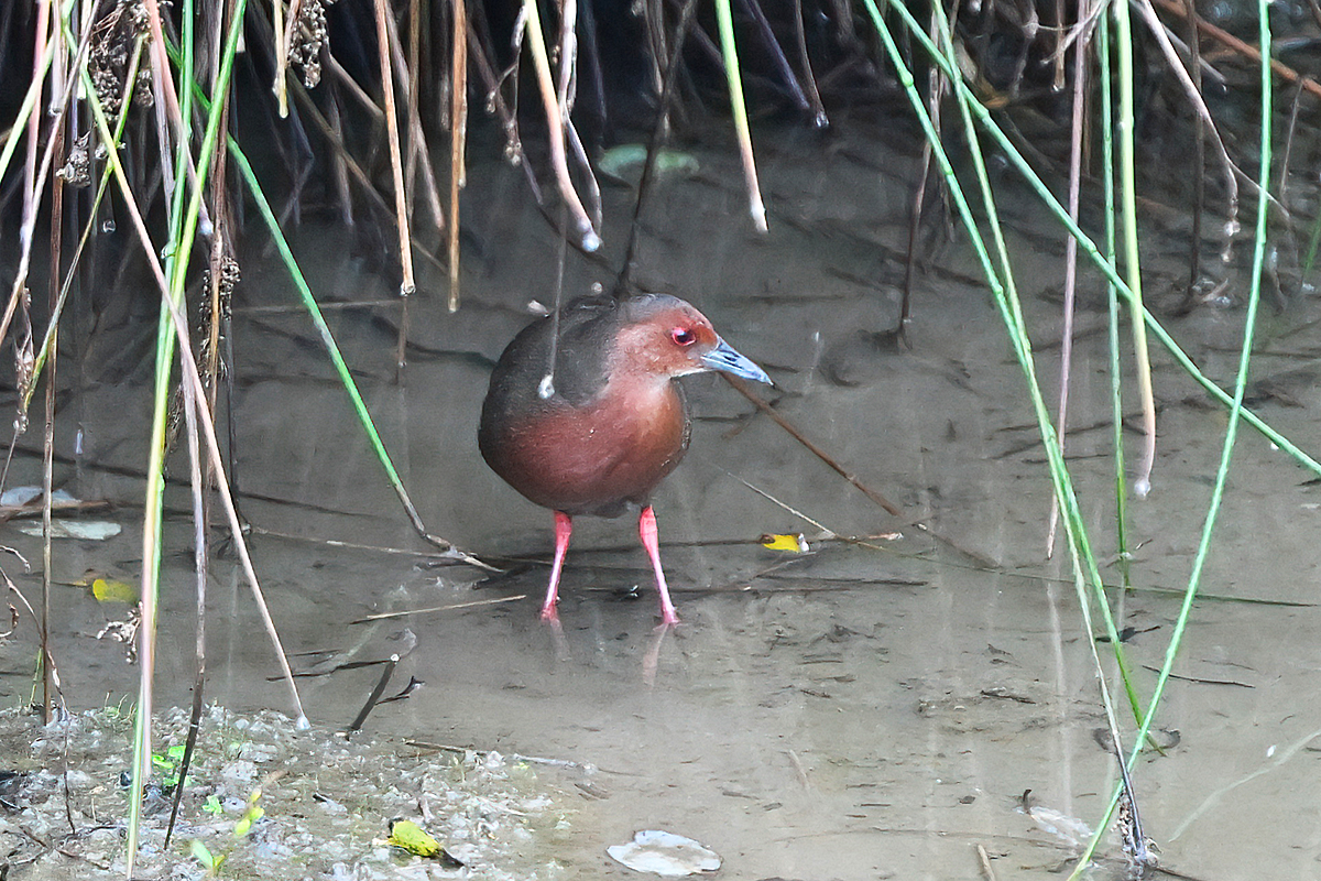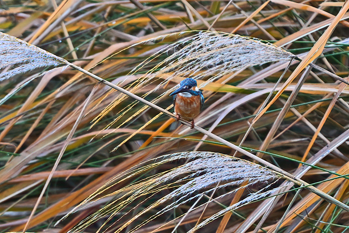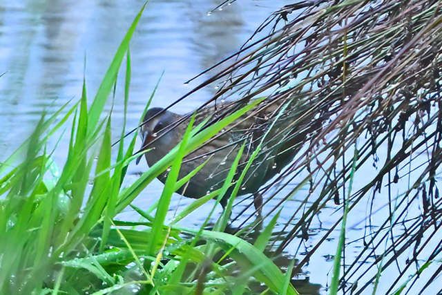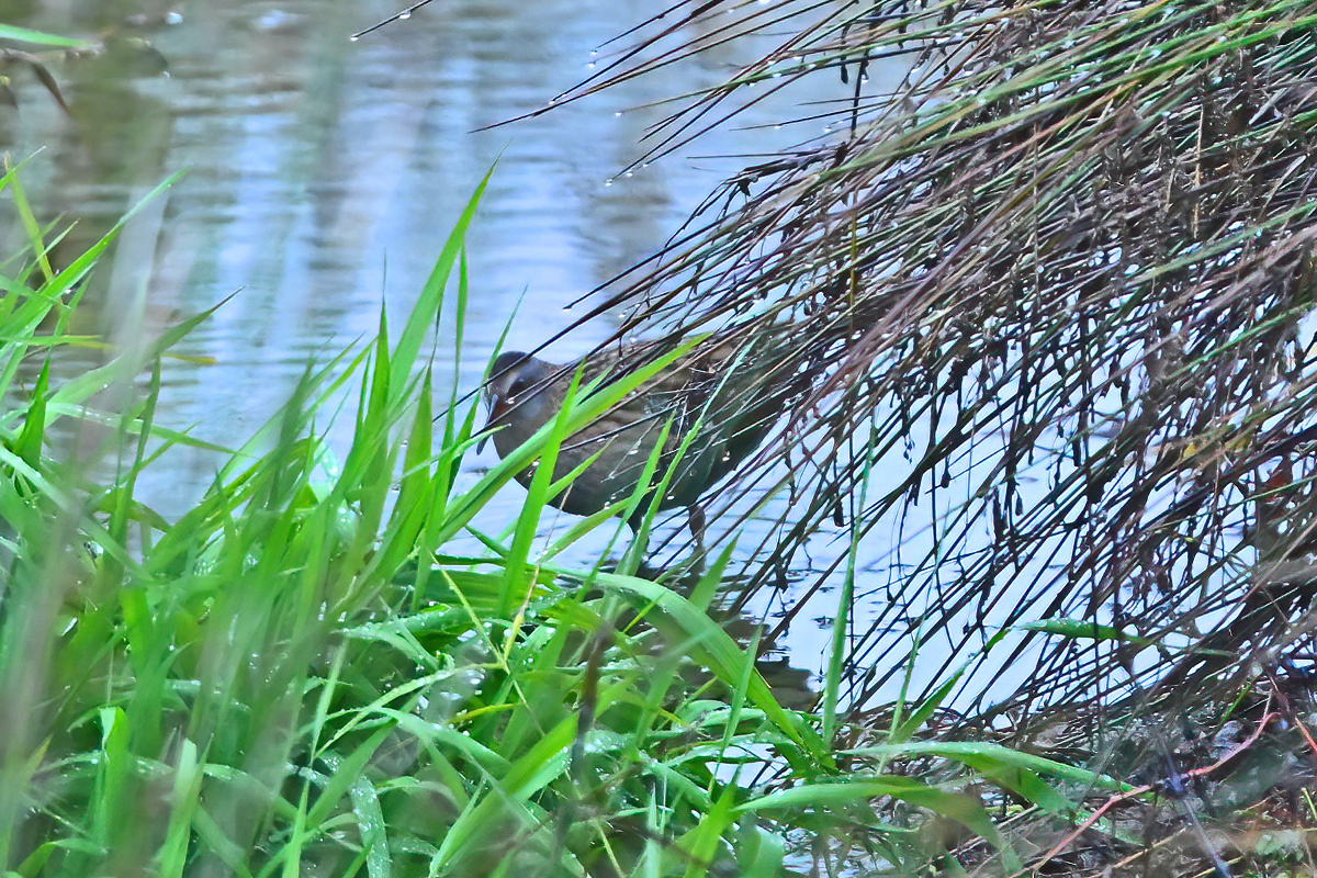 寒冷前線の通過で雨の降る、夕方の員弁川の堤防。 カワセミが飛翔通過。何度か中州から観察した経験から 留まっている場所の検討がついたのでその付近へ移動。 堤防からは見えない場所ながら、飛び込みが見られました。 それから20分間ほど動きが無かった後、中州に飛び移った ところを撮影。カワセミが再び元の場所に戻ったところで、 その向こうの水辺にクイナのいるのを見つけ、さらには ヒクイナも登場。どれを撮影するか、迷いながら、全身の 見えていたヒクイナを撮影。すでにかなり暗くなっている上に 陰になる場所にいたので、低速シャッターで連写し、動きの 留まった被写体ブレのないカットを選択しました。 冬枯れが進んで見える範囲が増えてきており、今日の 観察場所は、今後、有効になってきそうでした。 |