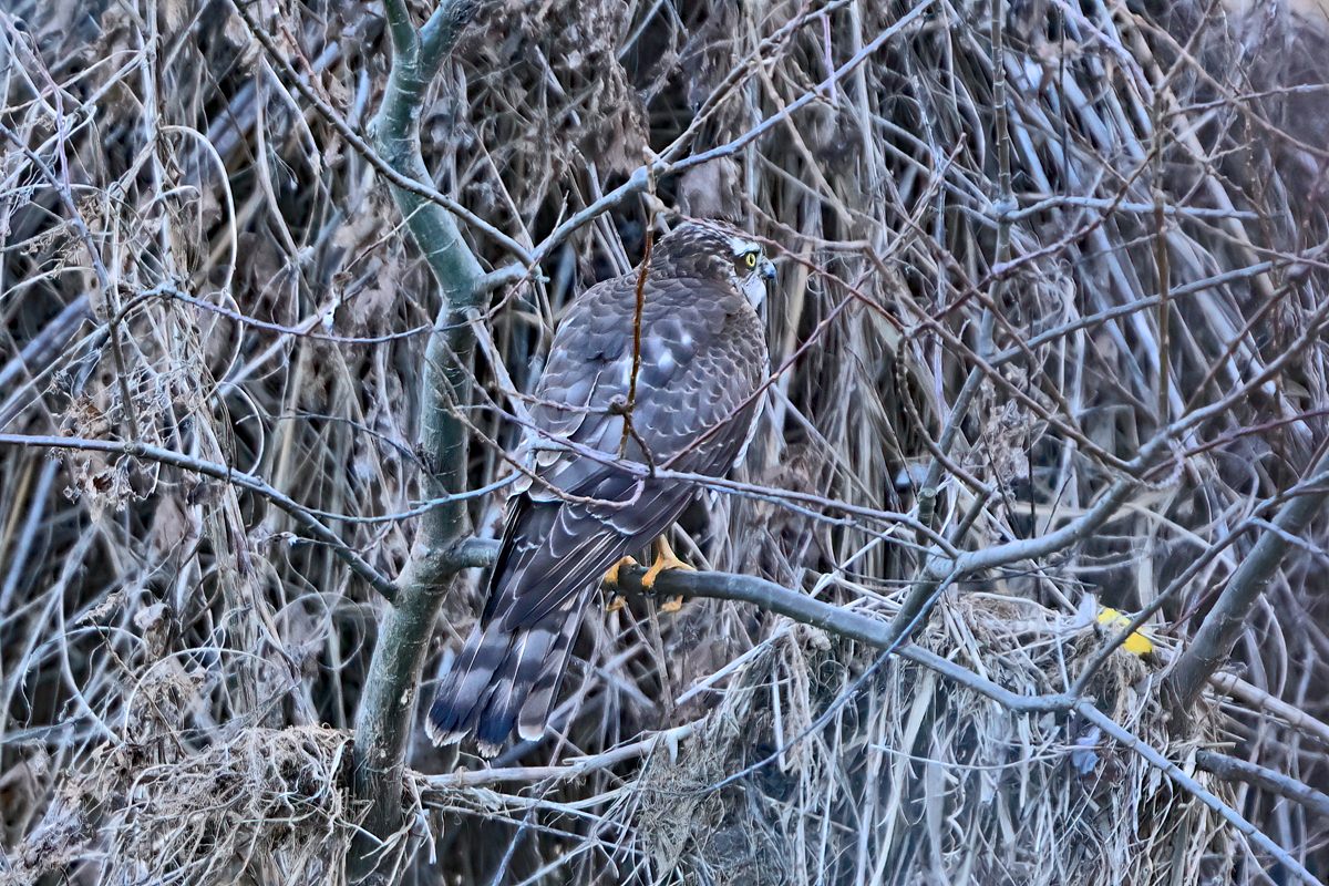 強烈な寒気が入って気温が3度くらいになった夕方の員弁川。 堤防から観察していると、カワセミの飛翔通過や、どこかに 潜むときのカワセミの鳴き声などがありました。 また、わりと早い時間帯に、ヒクイナが一瞬姿を見せるも 撮影はできず。 そこへ川沿いの細い水路を低く飛んできた鷹が1羽。 ハイタカの幼鳥のようです。雨覆や肩羽に淡い褐色の羽縁、 長めの尾羽には黒褐色の横縞が4本あることなどの特徴 が写真に見られます。また、尾羽や風切羽の先端に年齢線 (幼鳥線、サブターミナルバンド)と呼ばれる白っぽい、帯状の 模様が見られ、これが幼鳥の特徴としてあげられるようです。 日没後にクイナも一瞬、姿を見せました。 |