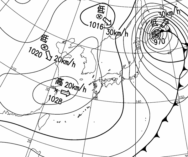 | 地上(高知大学気象情報頁赤外画像と気象庁速報天気図を合成) 9時 | |||