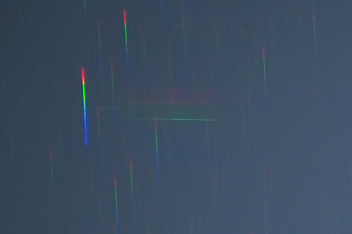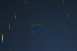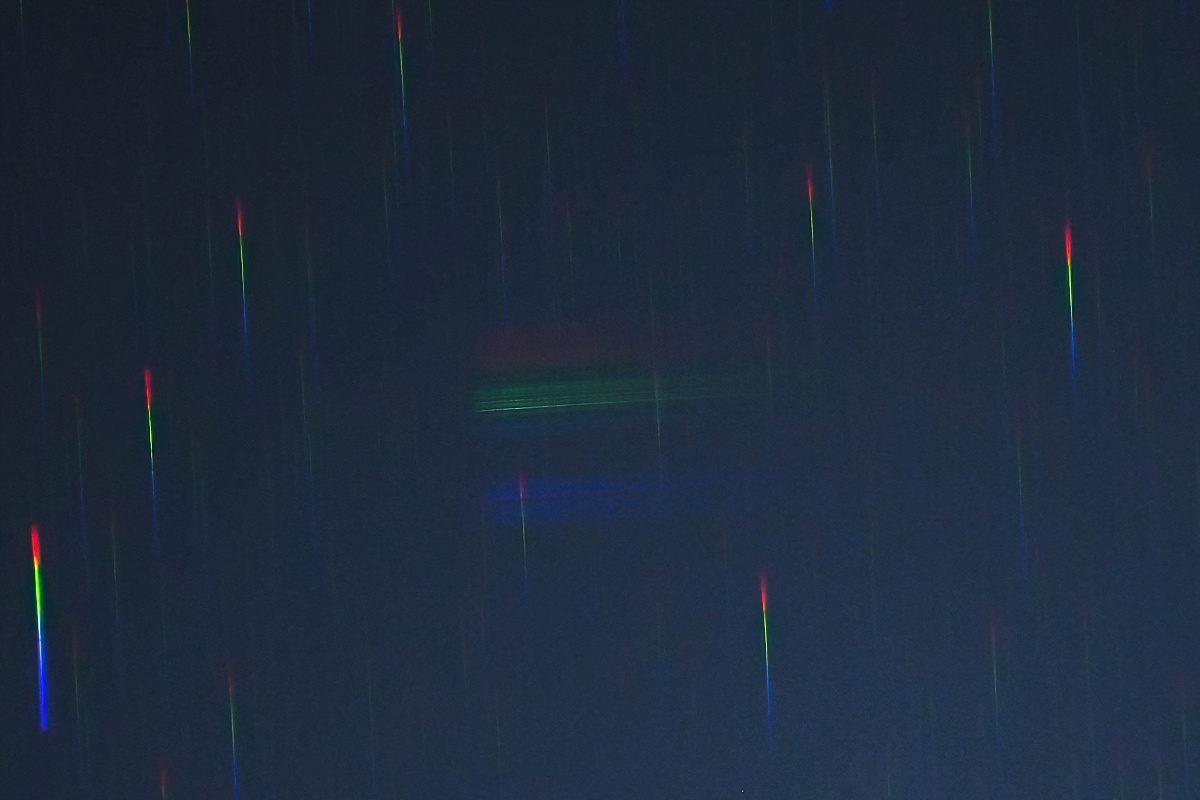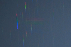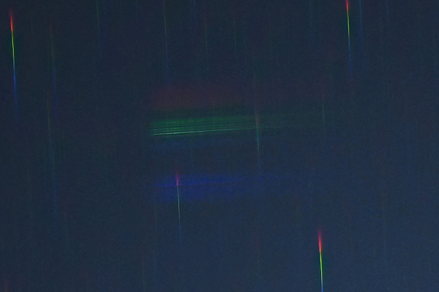 | ふたご座流星群 スペクトル 0時40分 85mmf1.8 4秒 ISO800 対物プリズム使用 |