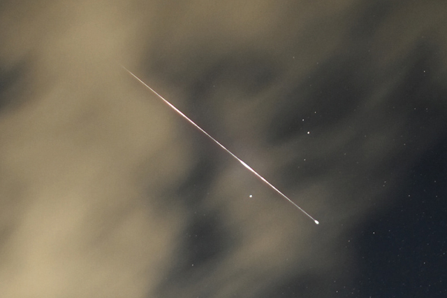 ふたご座流星群 スペクトル 0時49分 85mmf1.8 4秒 ISO800 対物プリズム使用 (流星出現中に露出開始) |