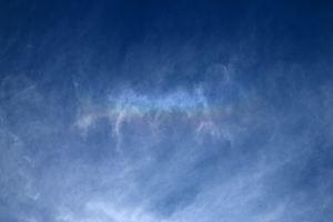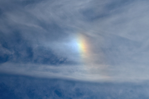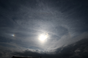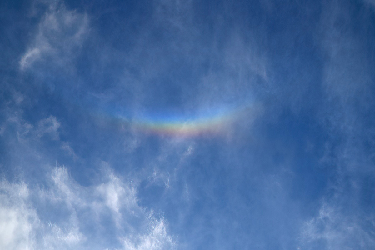| 高気圧の中心が東に移動して、午後になると、層積雲に隠されながらも 上層の巻層雲が広がってきました。明るく色鮮やかな幻日が出現し、 その前を層積雲が通り過ぎながら、幻日はかなり長時間継続しました。 環天頂アークも現れ始めて、いっとき、かなり明るく鮮やかに! 両者は 同じ氷晶が原因なので、このように同時に見られることがよくあります。 |