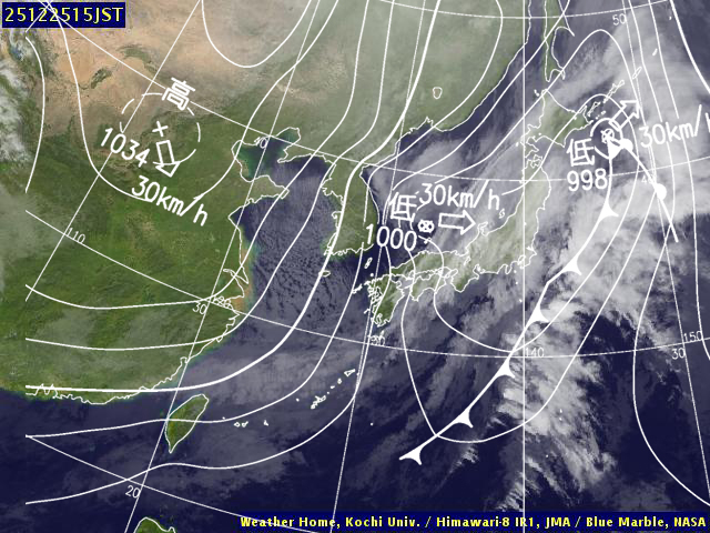 | 地上(高知大学気象情報頁赤外画像と気象庁速報天気図を合成) 15時 | |||
