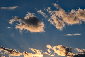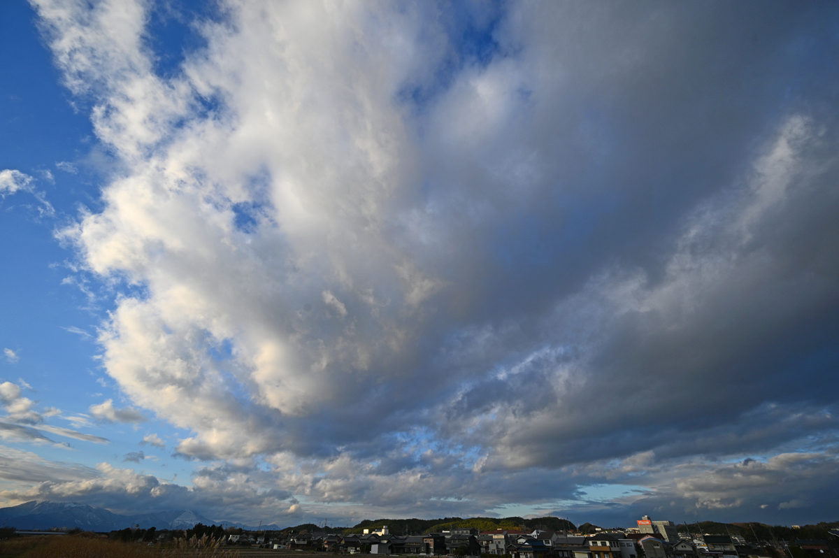 | 昨日の厳しかった冬型気圧配置の寒さと風がおさまり、おだやかな陽気に なりました。空には積雲や層積雲は多く、夕方、これらが消えてゆくと レンズ雲がたくさん見えてきました。太陽近傍では美しい彩雲も生じました。 |
