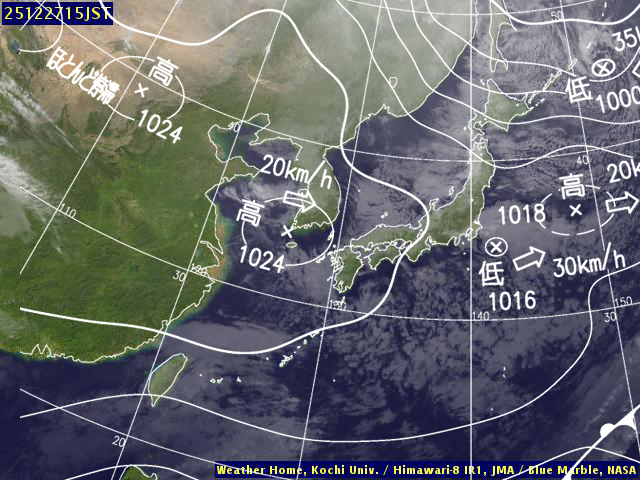 | 地上(高知大学気象情報頁赤外画像と気象庁速報天気図を合成) 15時 | |||