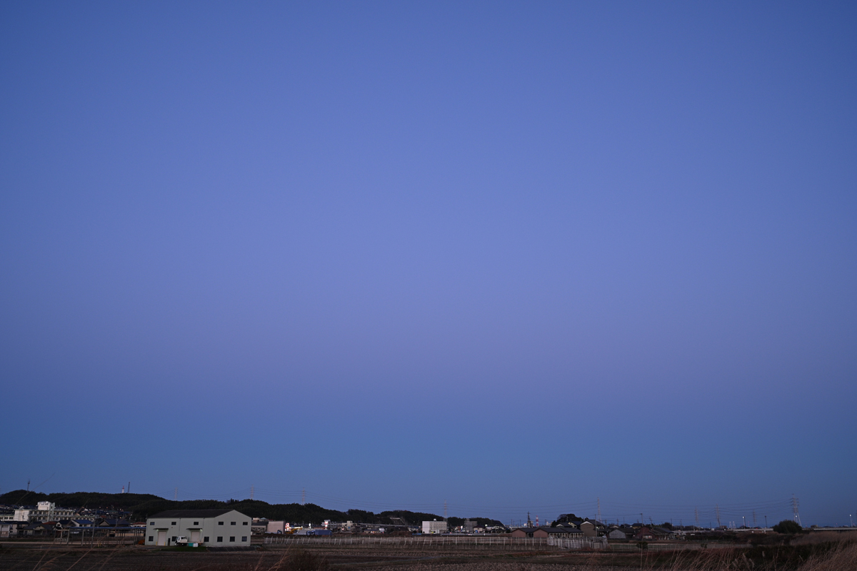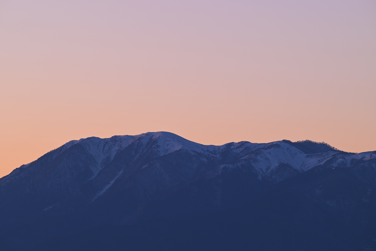 | 高気圧に覆われた晴天。 朝のうちは層積雲が広がりましたが、その後はほとんど雲の無い快晴の空。 日没頃には鈴鹿山脈の雲もすっかり消えて、夕焼けの赤い空を背景にして、 積雪が日没後の残照に照らされた、美しい稜線がとても印象的でした。 |