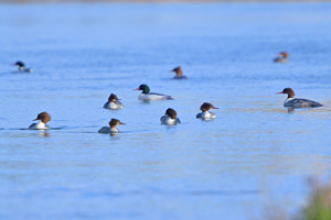| カワアイサの群れ | メスが多い。中央はオス。 12羽ほどの群れで、オスは3羽。 |