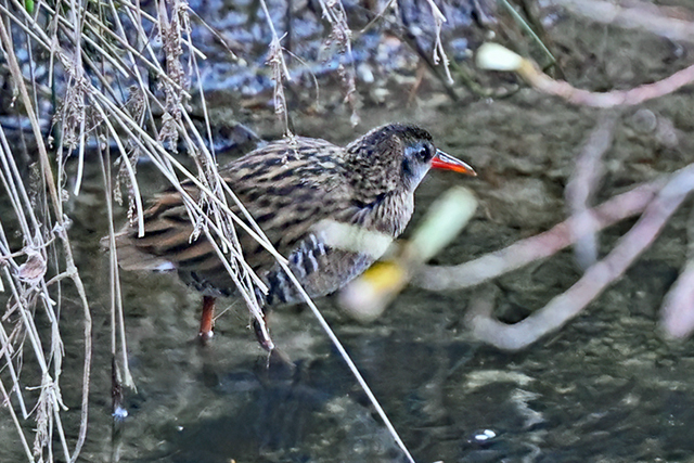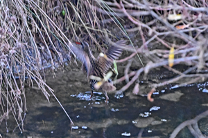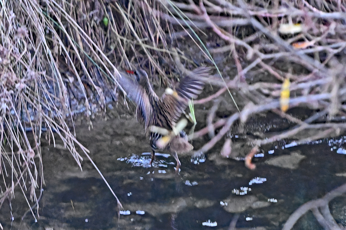 積雪の残る、夕方の員弁川。 野鳥の活動は低調で、カワセミもあらわれず。 最近、群れで見かけるツグミが今日は1羽で樹木に。 日没後に,、中州の岸辺に波紋が生まれているのを発見。 草の陰はもう肉眼ではよく見えない暗さでしたが、レンズを 向けると、クイナでした。 羽ばたきも見ることができました。 |