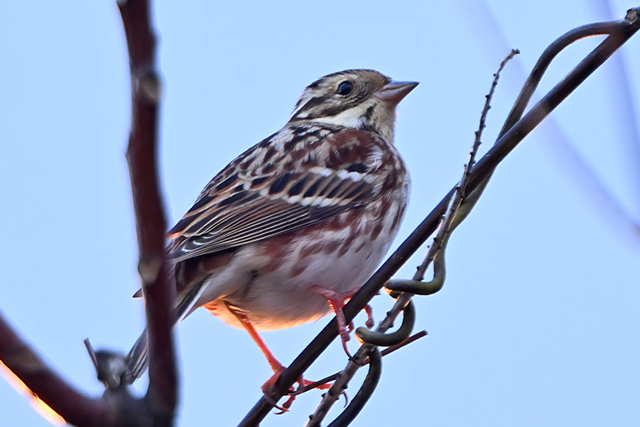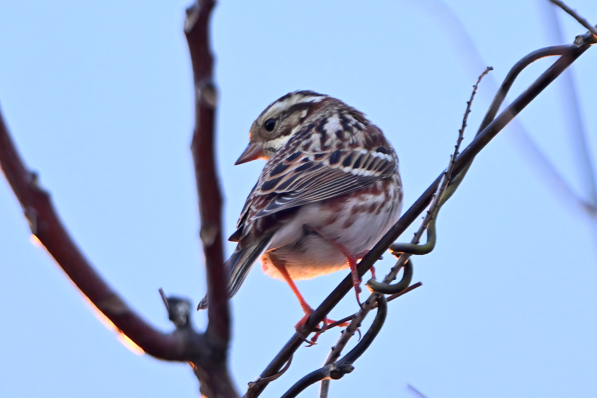 | 夕方の員弁川にて。 ホオジロに似た鳥が中州と岸辺の樹木に。腹部が白いのでホオジロではなく、 羽の模様からもカシラダカのようです。カシラダカといえば冠羽を立てている姿 が印象的ですが、リラックスしているときには寝かせていることもあるようです。 また、冬羽のメスはほとんど冠羽を立てないようで、この個体は長い時間、一度も 冠羽を見せていないことから、メスのように思われます。(自信のない同定・・・) 中州の遠い場所に、背中が灰色の鳥・・・・コチョウゲンボウのオスのようです。 昨日、明るい時間帯に現れたクイナは、今日は日没の頃。遅いシャッター 速度で連写して、被写体ブレのないカットを選択しました。 他に、観察のみだったのは、手前岸の見えないところから飛び出した カワセミと、樹木の裏側に留まってそこから飛び立ったハイタカです。 |