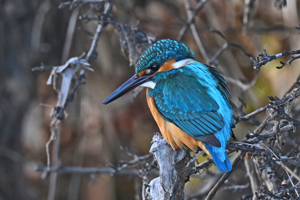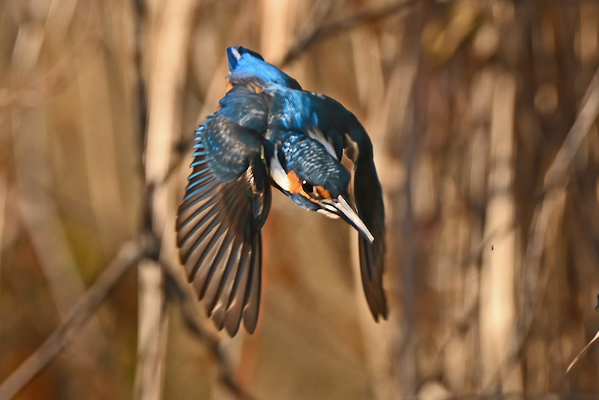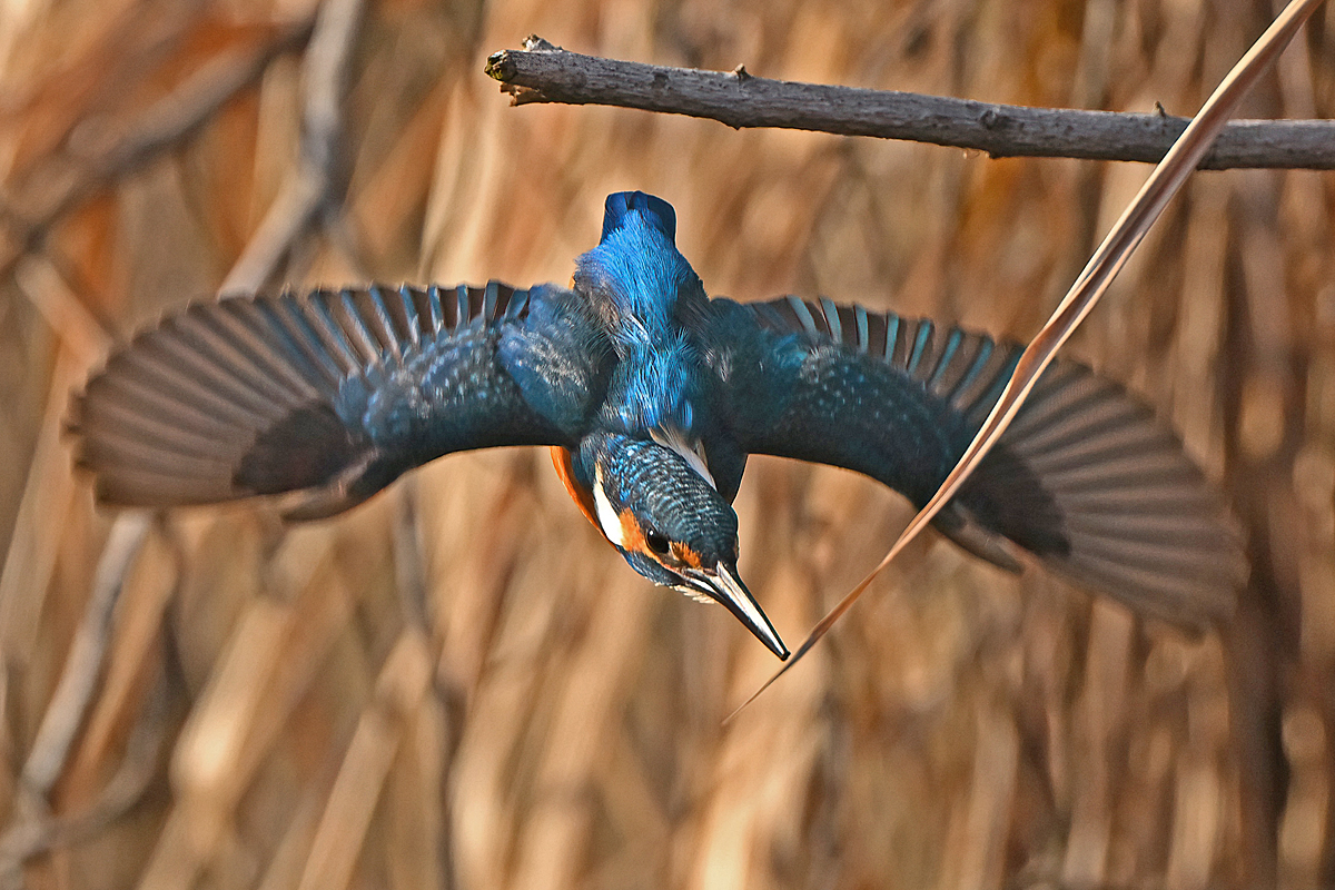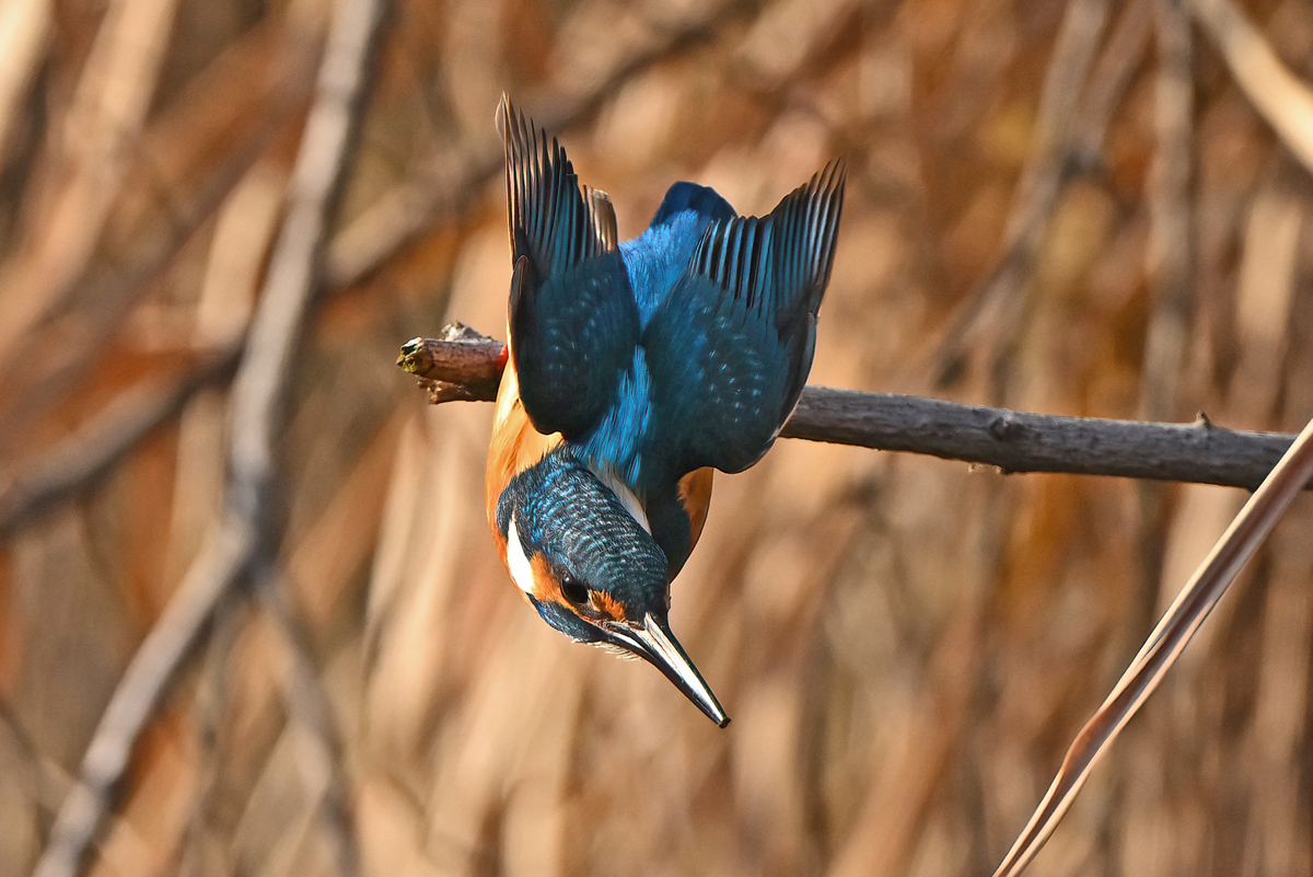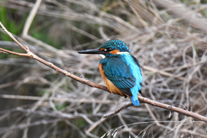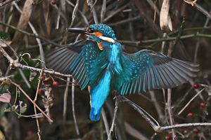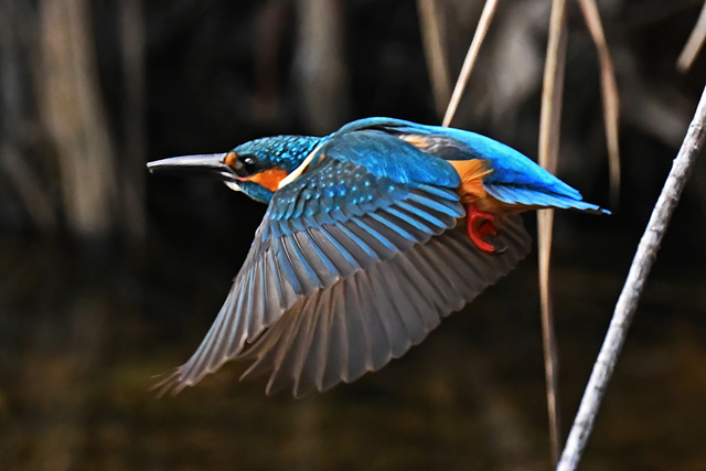 | 午後、昨日と同じく、員弁川流域北側の小さな用水路にて、カワセミを撮影。 昨日のページにコメントしたように、カワセミが2羽いたのではないかという 推測は正しく、2羽のカワセミがもつれ合って飛ぶシーンを目撃しました。 オスの方を撮影し続けましたが、太陽が雲に隠れたり、照ってきたりと、 刻々と光線状態が変化し、さまざまなカワセミの色合いが見られました。 ゆっくりと追った結果、10m以内の近距離撮影もたくさんありました。 今日は連射の効くカメラを使用して飛翔シーンもたくさん狙いました。 機材をリュックに入れて歩いて行ったので、三脚の持参をサボったのは ちょっと後悔・・・・。 構え続けた腕は、パンパンの筋肉痛になりました。 |