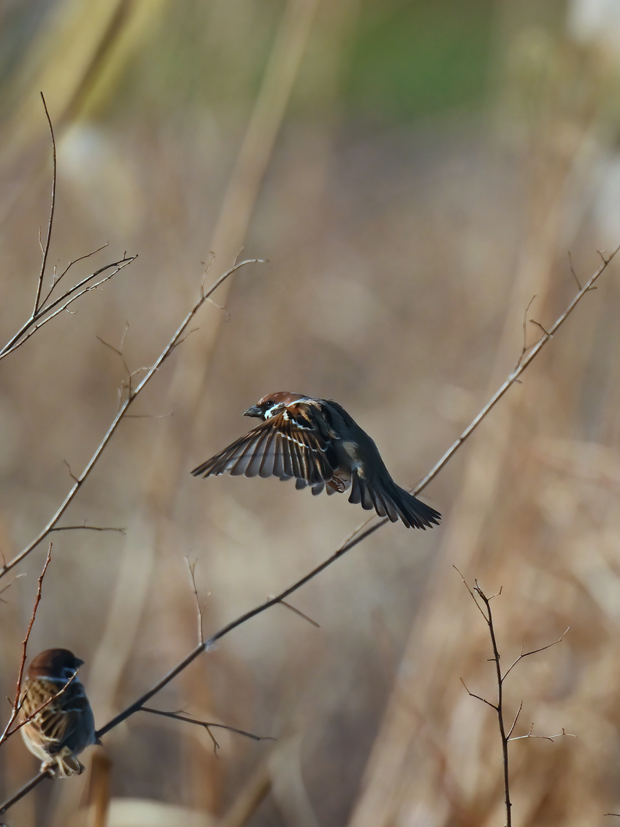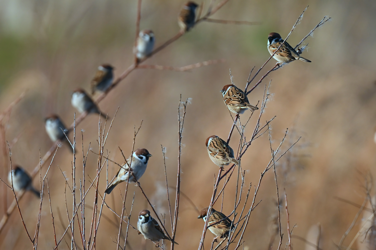 | 「日没前のカワセミ/ムクドリ/草むらにスズメの群れ」(桑名市) | |||