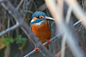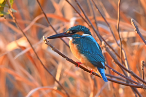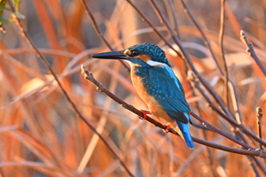 | 午後、カワセミのいるはずの用水路にて。鮮やかな色を持つメスの個体は 水路から続く暗渠から出たり入ったりしていたものの、警戒心が強いようで なかなか撮影はさせてくれない動き方でした。 それならば、と、別の個体 を探して2時間半ほども用水路に沿って往復して歩いたものの、昨日まで 簡単に出会っていたカワセミが今日はなぜかなかなか現れませんでした。 日没前、メスの個体が活動していた場所でようやく鮮やかなカワセミを発見。 警戒心も弱く、オスの個体に見えましたが、強い夕陽を受けているせいか、 下嘴は少し赤みを帯びてもおり、雌雄判別はちょっと微妙なところです。 先週の月曜日から7日間連続で用水路のカワセミを追ってみました。 約1300mの用水路の区間に、オス1羽、鮮やかなメス1羽、幼鳥っぽい メス1羽、と計3個体のカワセミが来ているようです。ザリガニや小さい 魚を捕食していました。オスは警戒心が弱いようで、近距離撮影も可能 で、カワセミのさまざまな活動の姿を見させてもらうことができました。 |