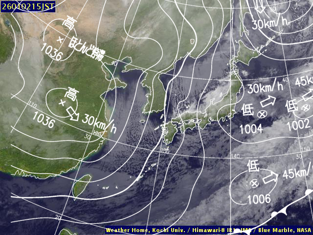| 地上(高知大学気象情報頁赤外画像と気象庁速報天気図を合成) | |||