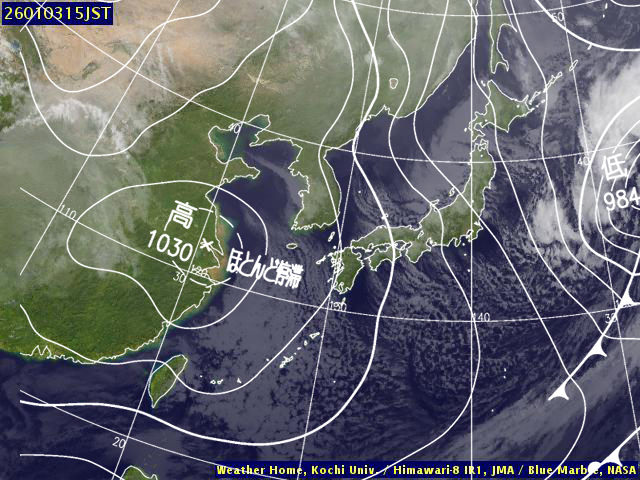| 地上(高知大学気象情報頁赤外画像と気象庁速報天気図を合成) | |||
