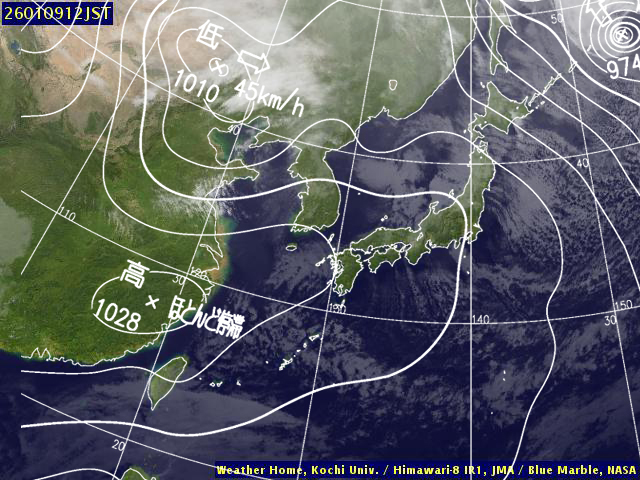| 地上(高知大学気象情報頁赤外画像と気象庁速報天気図を合成) | |||