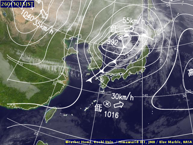 | 地上(高知大学気象情報頁赤外画像と気象庁速報天気図を合成) | |||
