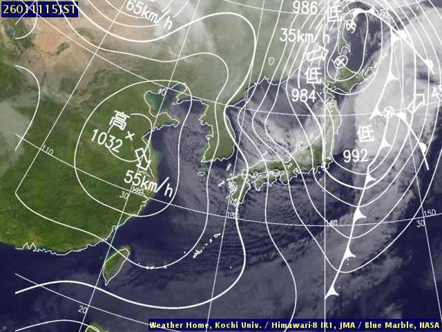 | 地上(高知大学気象情報頁赤外画像と気象庁速報天気図を合成) | |||