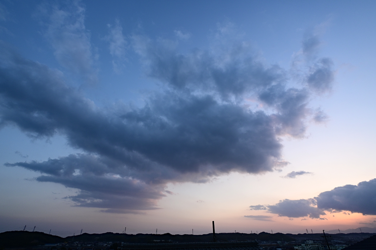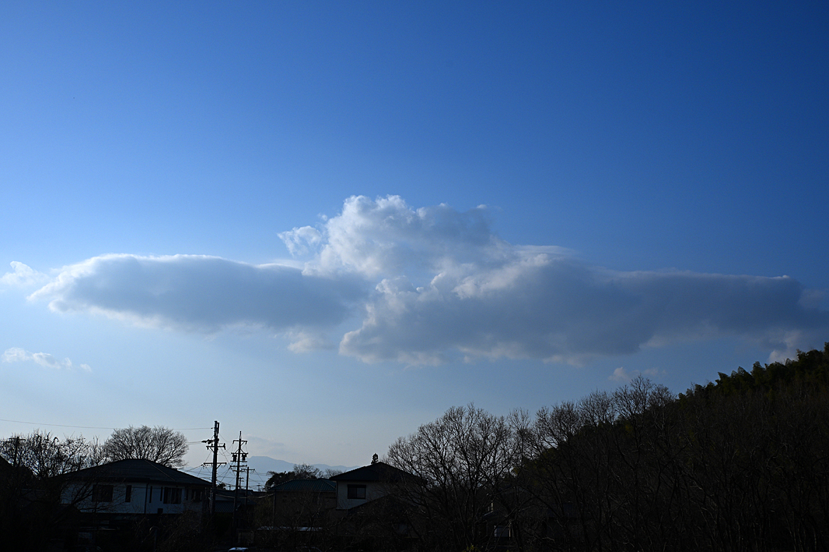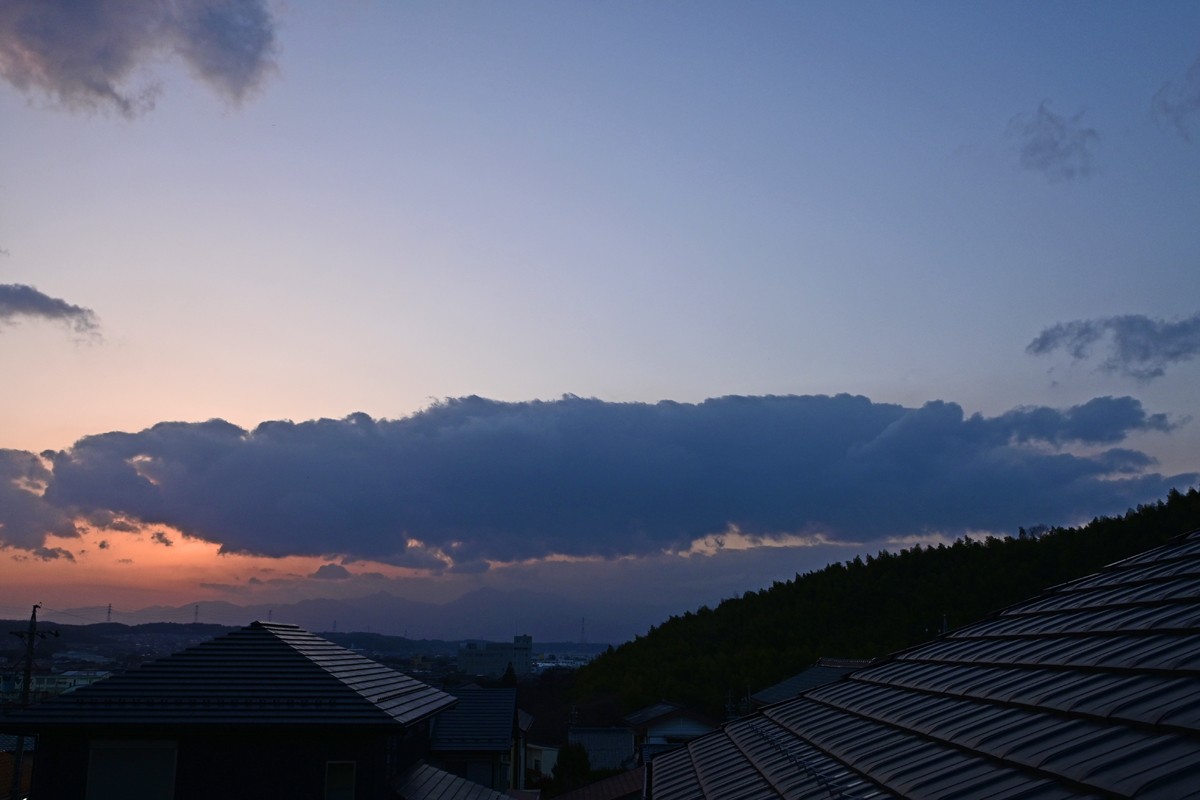 高気圧に覆われて快晴の晴天となり、最高/最低気温(桑名)は 16.1/2.7℃と、朝は冷え込んだものの、日中は陽射しもあって、 体感的にはほとんど春のような、あたたかな陽気となりました。 黄砂もあってかすみがちの空でしたが、夕方になって鈴鹿山脈の 山麓から湧き出すように地形性の雲(層積雲)が生まれてきました。 |