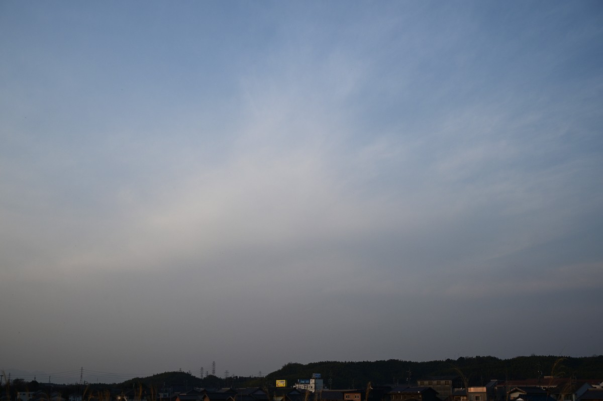 | 日本海の低気圧に伴う前線が接近し、暖域の晴天でしたが、 午後になると巻雲が断続的に到来し始め、夕方には巻層雲が 広がり始めました。黄砂も来ていて、かすみがちな空でした。 |