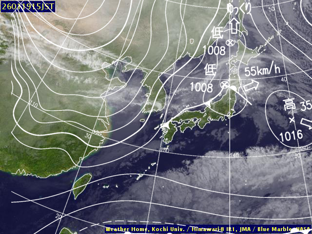 | 地上(高知大学気象情報頁赤外画像と気象庁速報天気図を合成) | |||