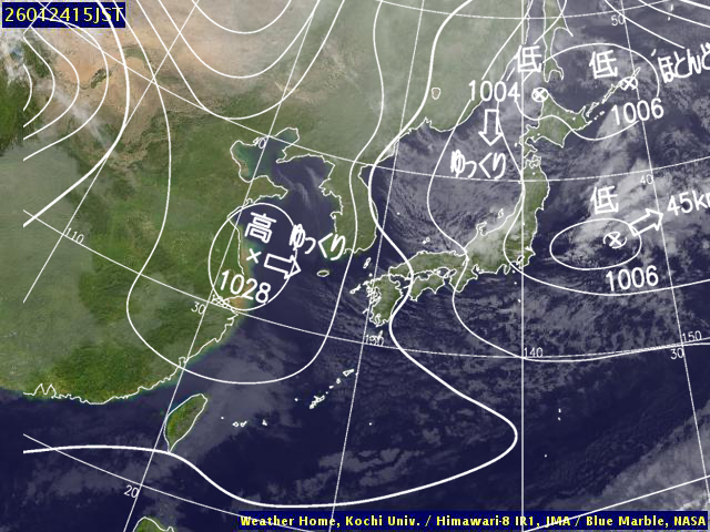 | 地上(高知大学気象情報頁赤外画像と気象庁速報天気図を合成) | |||