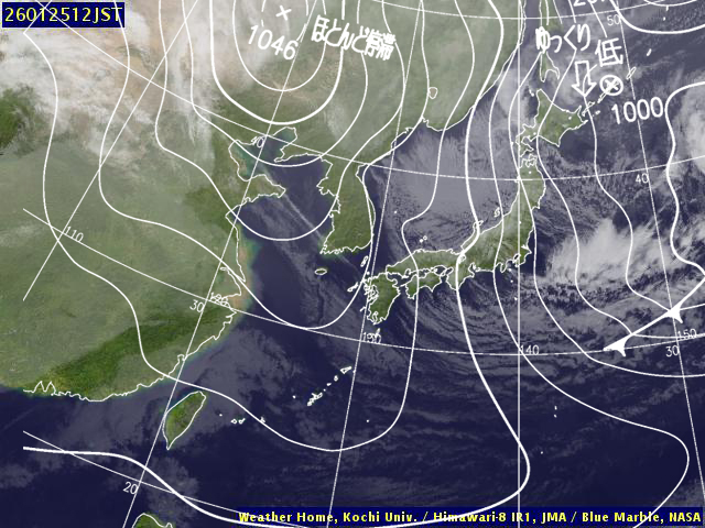 | 地上(高知大学気象情報頁赤外画像と気象庁速報天気図を合成) | |||