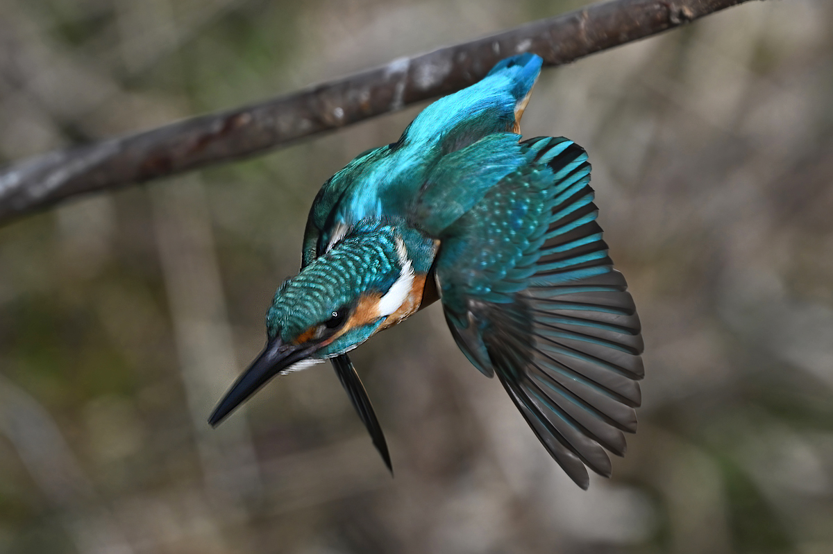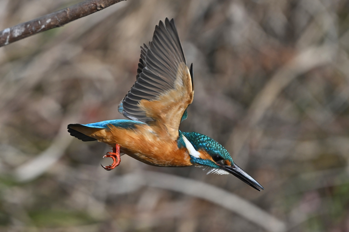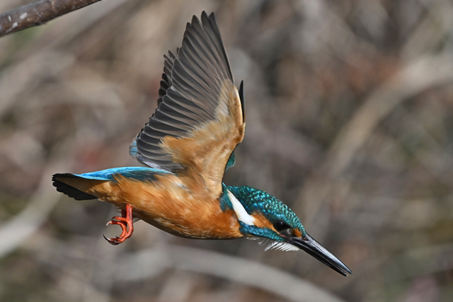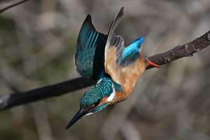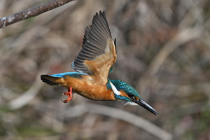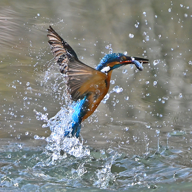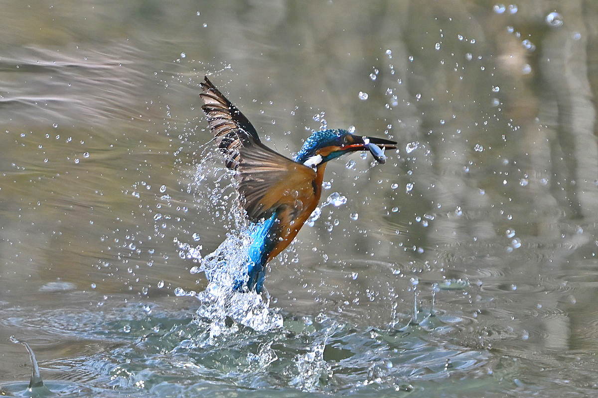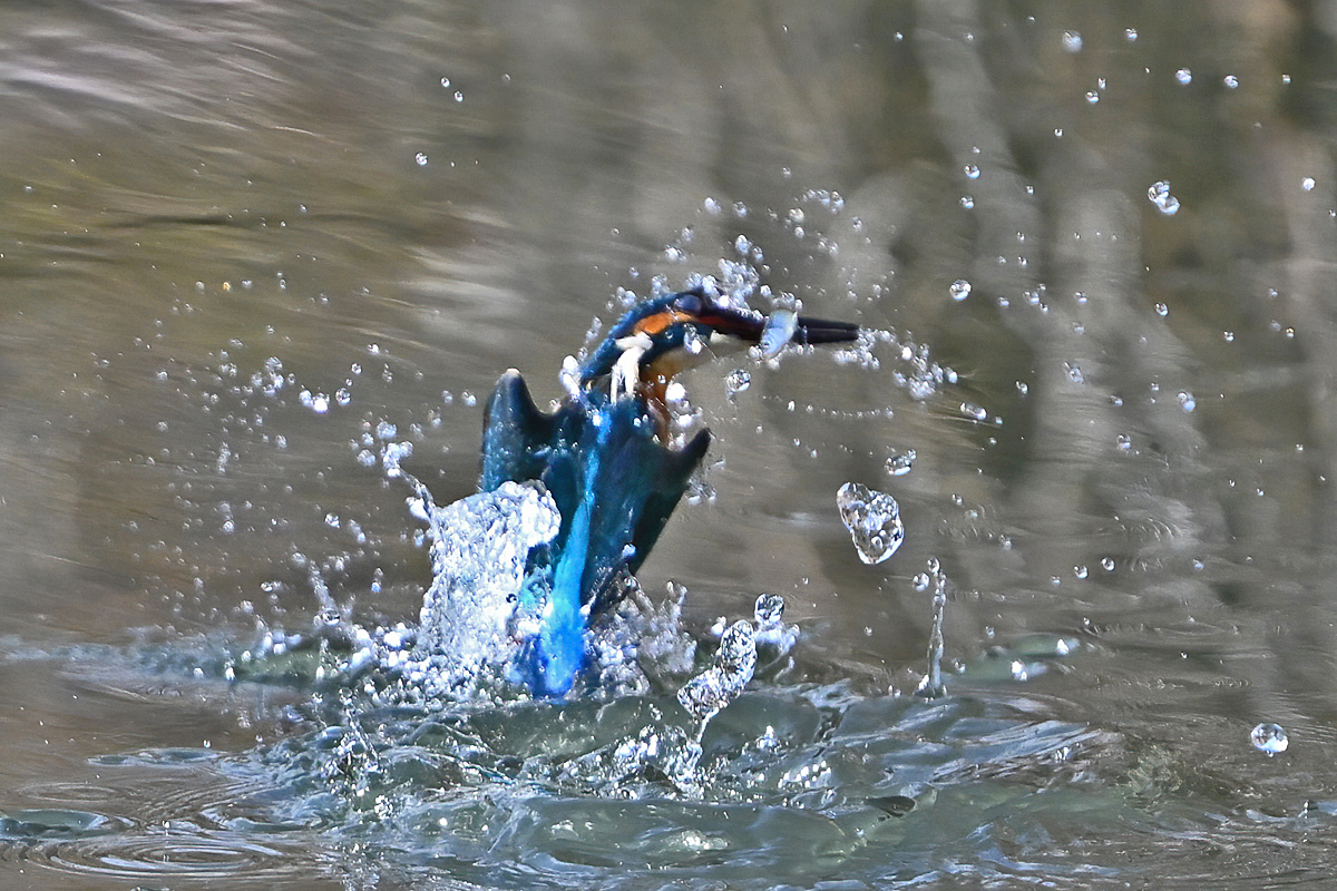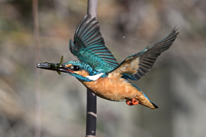 | 昼頃、用水路のカワセミ。 昼食(?)後だったようでほとんど動きません。 水面からの浮上飛翔を撮りたくて、数十分粘りました。 (それだけの時間、同じところにいるカワセミもすごい・・・) 初列・次列の風切からキラキラと輝きながら飛び出す 水滴の流線がとても美しい瞬間(1/8000秒)です。 |