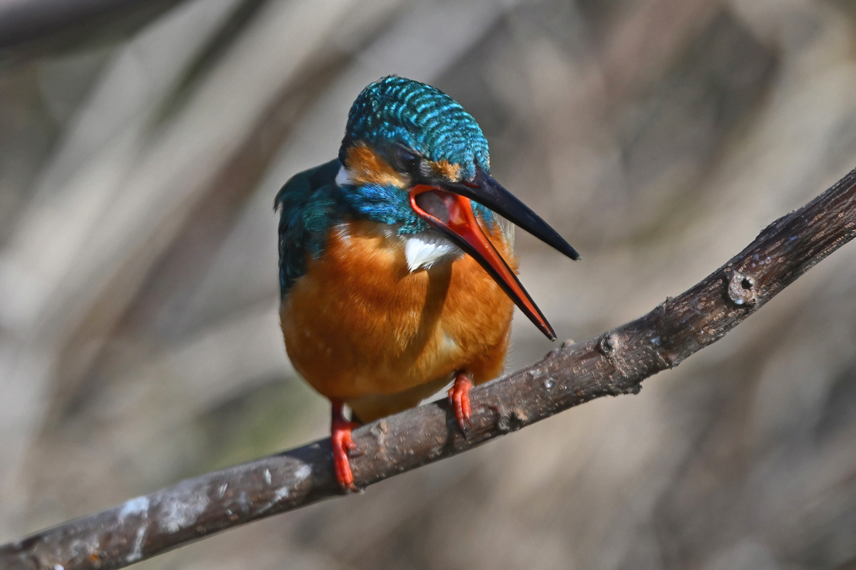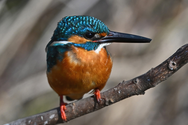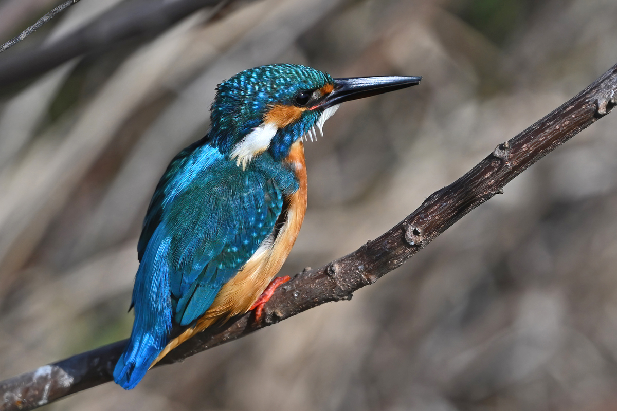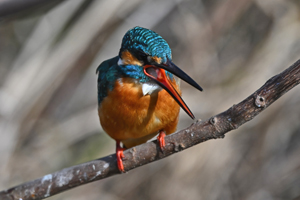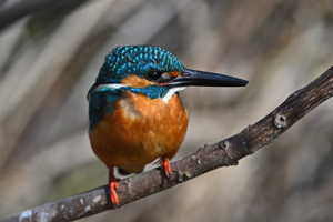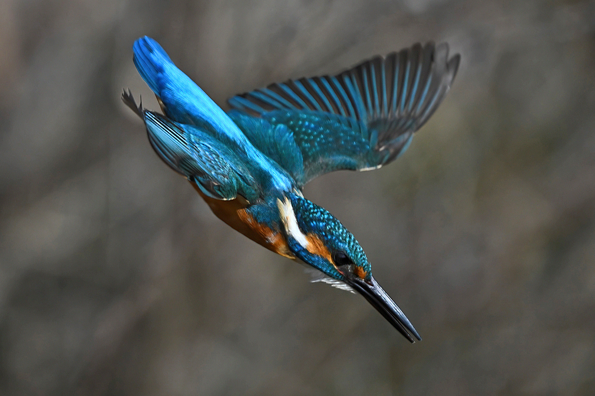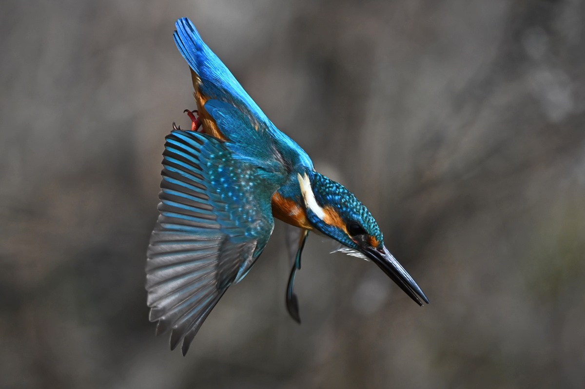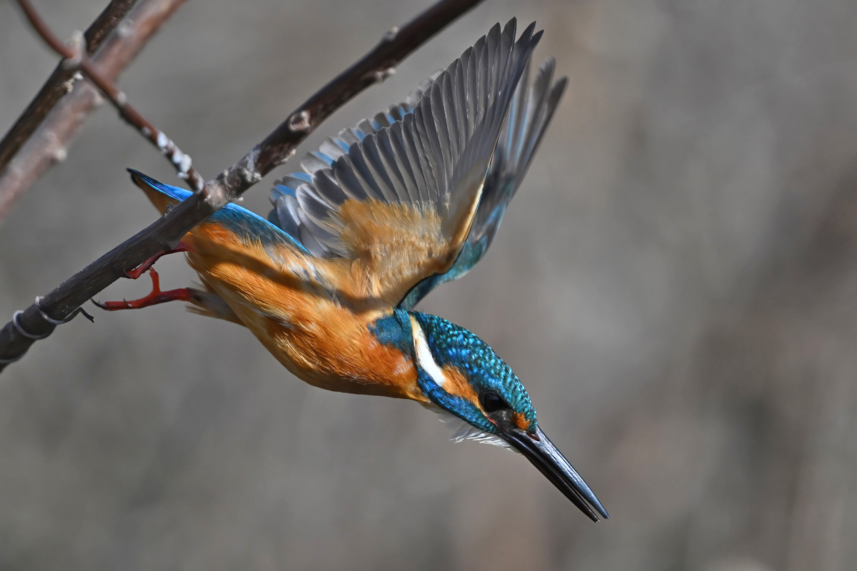 | 昼頃、用水路のカワセミ。 昼食(?)後だったようでほとんど動きません。 水面からの浮上飛翔を撮りたくて、数十分粘りました。 (それだけの時間、同じところにいるカワセミもすごい・・・) 初列・次列の風切からキラキラと輝きながら飛び出す 水滴の流線がとても美しい瞬間(1/8000秒)です。 |