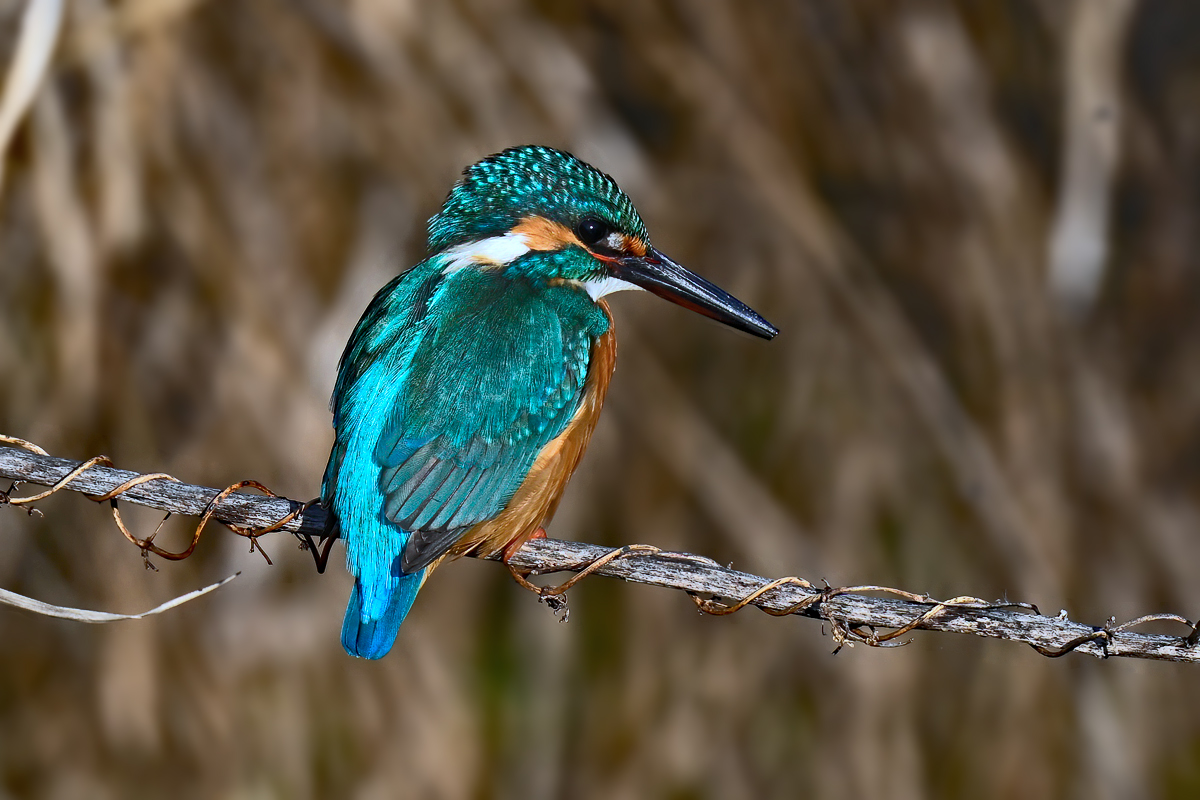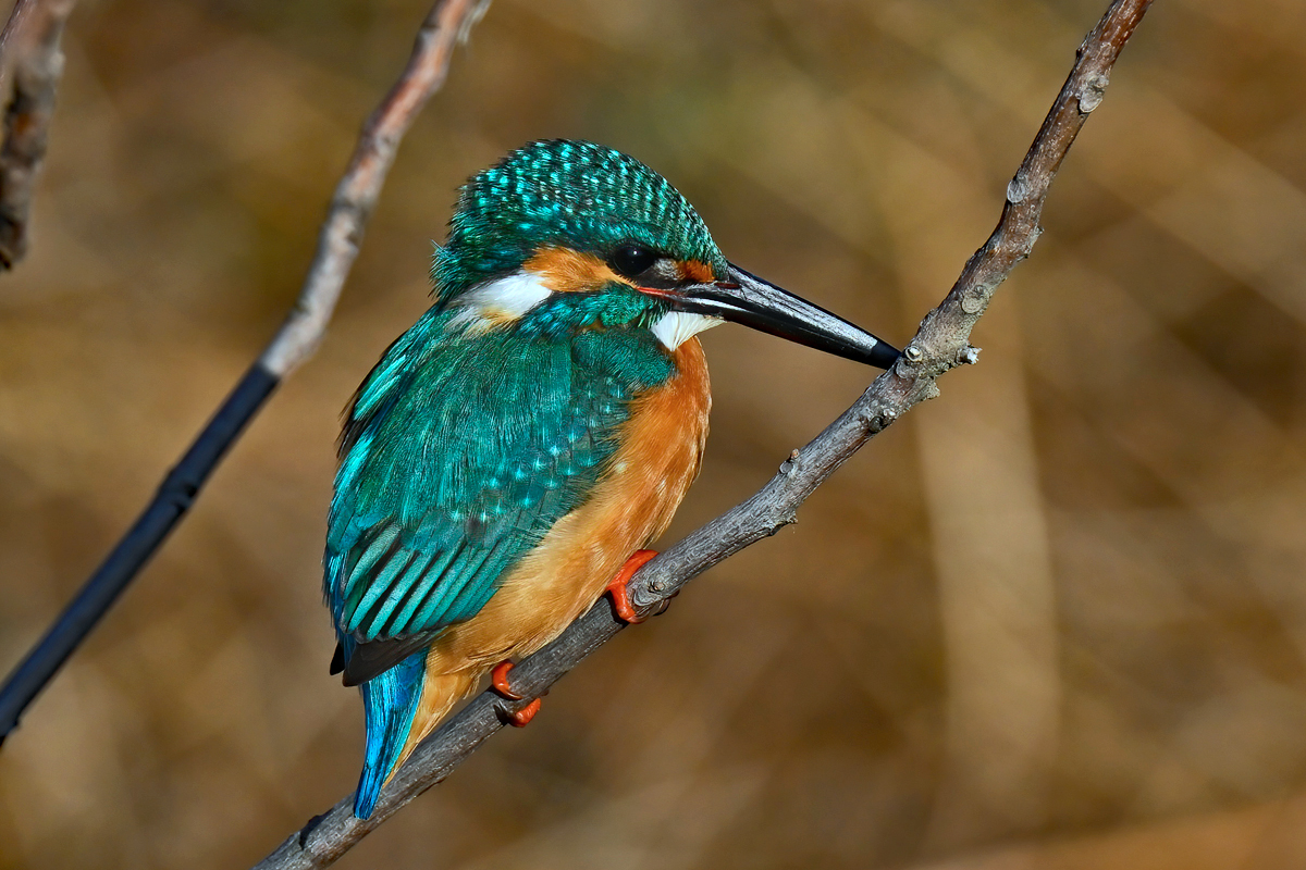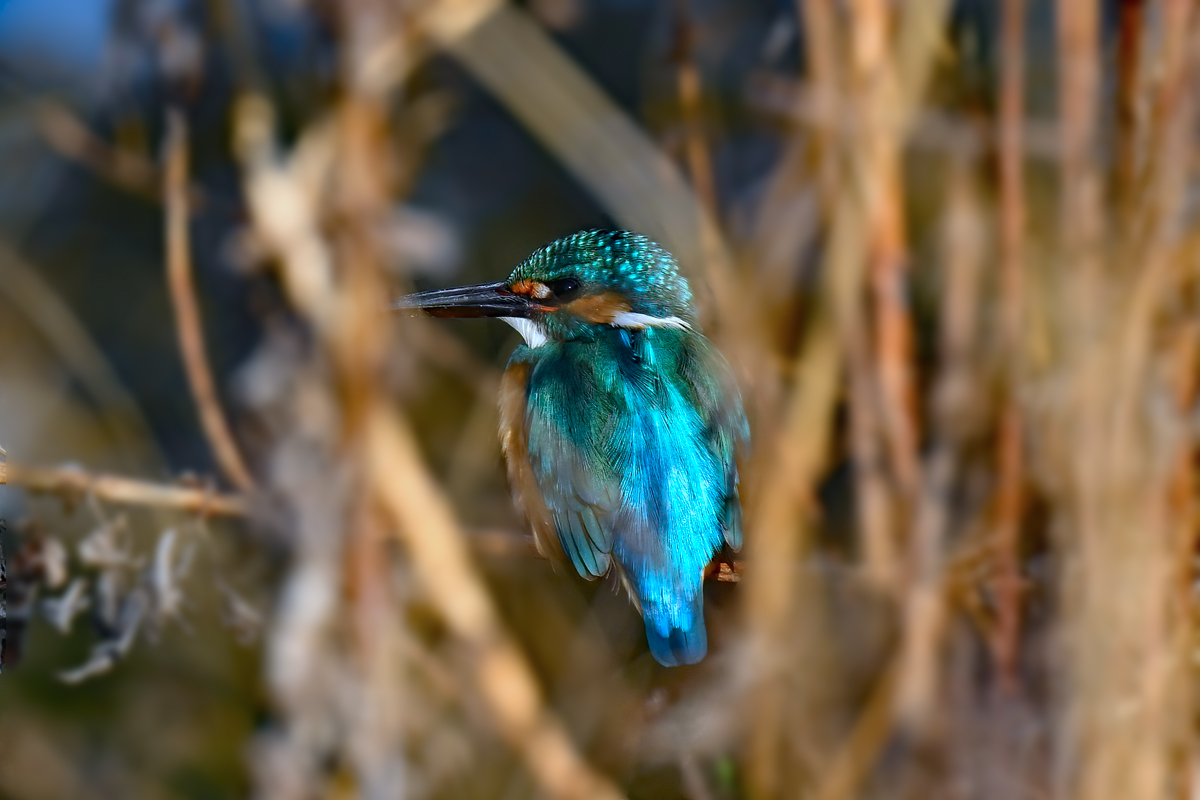 冬枯れの散歩道。枯れ草の隙間を通して宝石のように輝くカワセミに