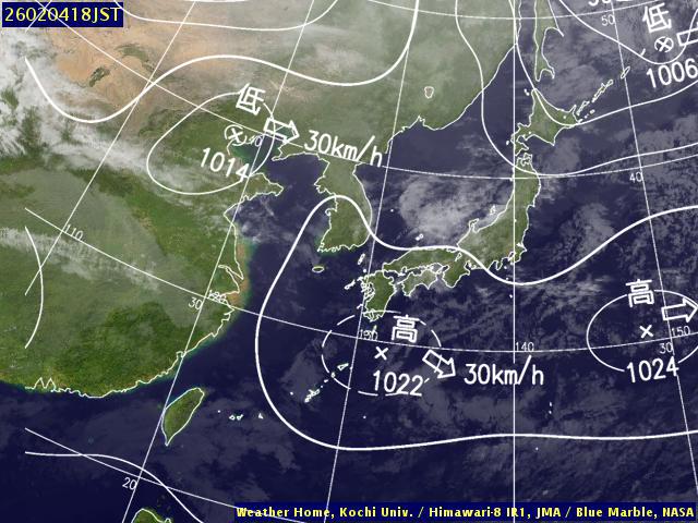 | 地上(高知大学気象情報頁赤外画像と気象庁速報天気図を合成) | |||
