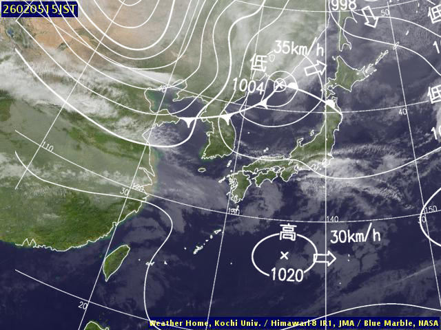 | 地上(高知大学気象情報頁赤外画像と気象庁速報天気図を合成) | |||