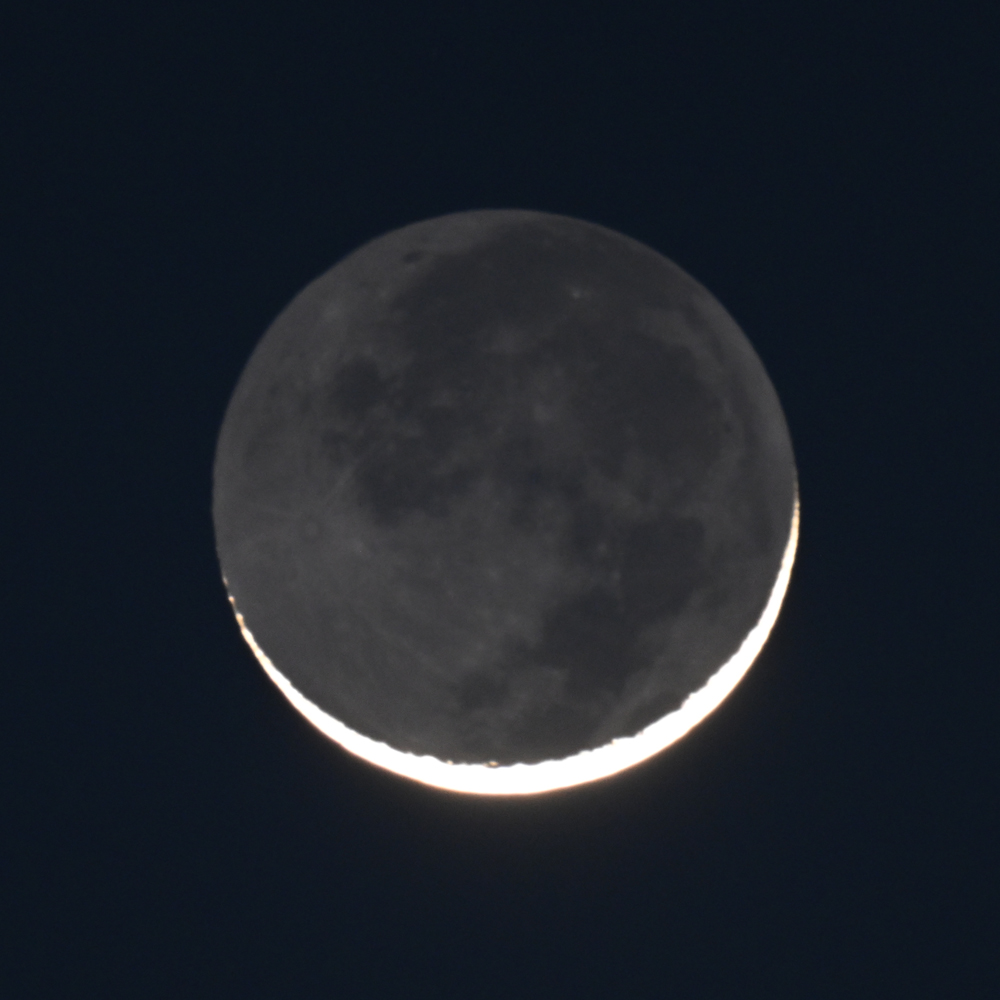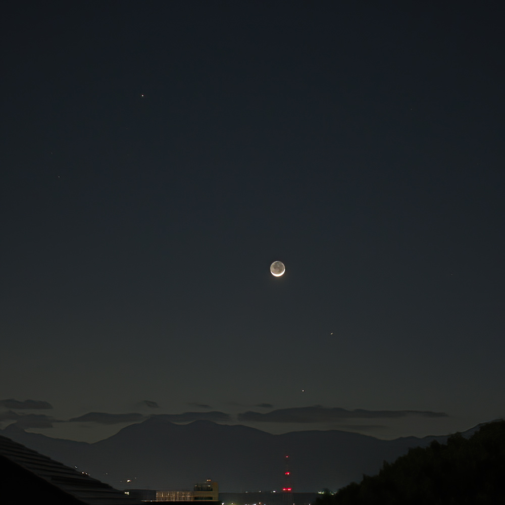 | 急発達をした低気圧が千島近海にあって、北海道の各地では 強い風雪になっています。三重県北部でも冷たい風が吹きました。 ほとんど雲の無い快晴の一日。 日没後、月齢2.0の細い月。美しい西空でした。 |