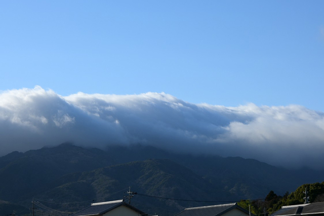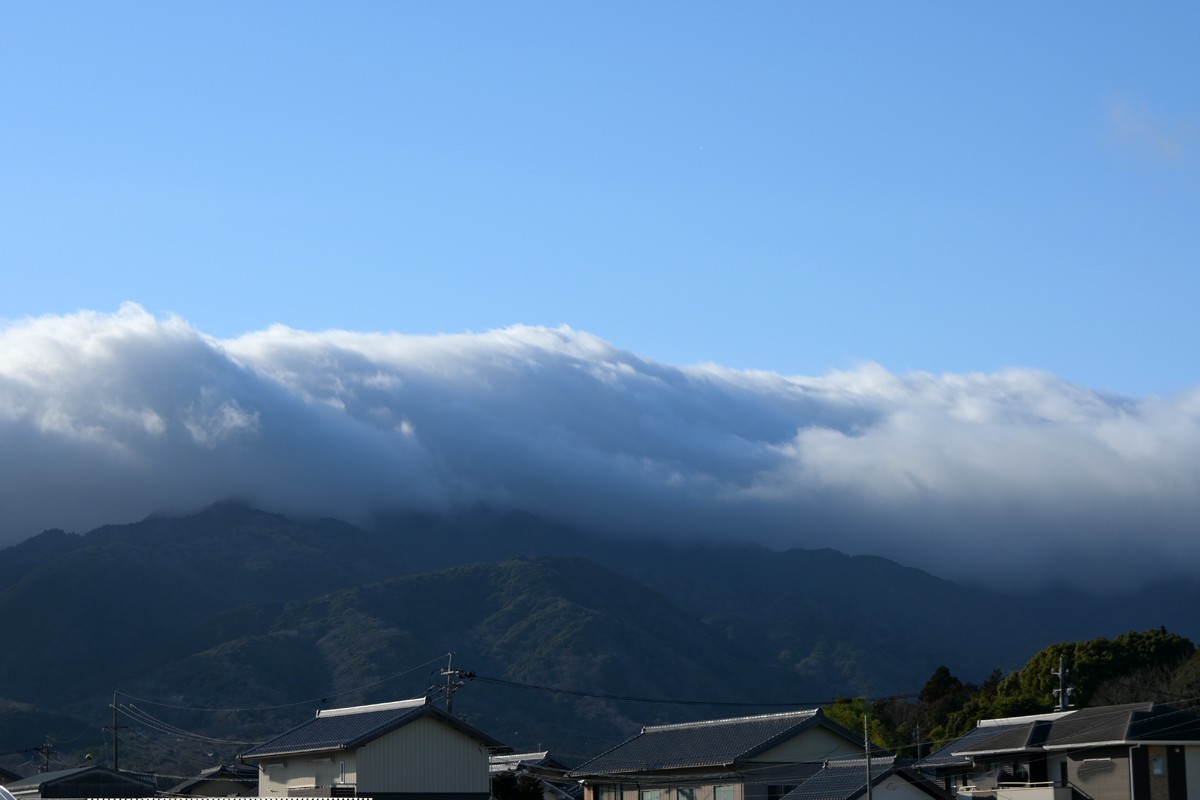 | 昨日南岸に連なっていた低気圧は三陸沖へ。 西高東低の気圧配置になって寒気が入ってきました。 晴天の下、鈴鹿山脈には終日、分厚い「風枕」の雲が かぶさり、強風のために毛羽立った様相でした。 |
