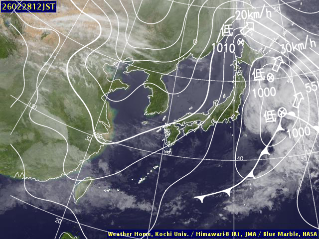 | 地上(高知大学気象情報頁赤外画像と気象庁速報天気図を合成) | |||
