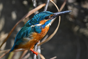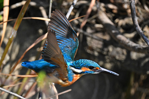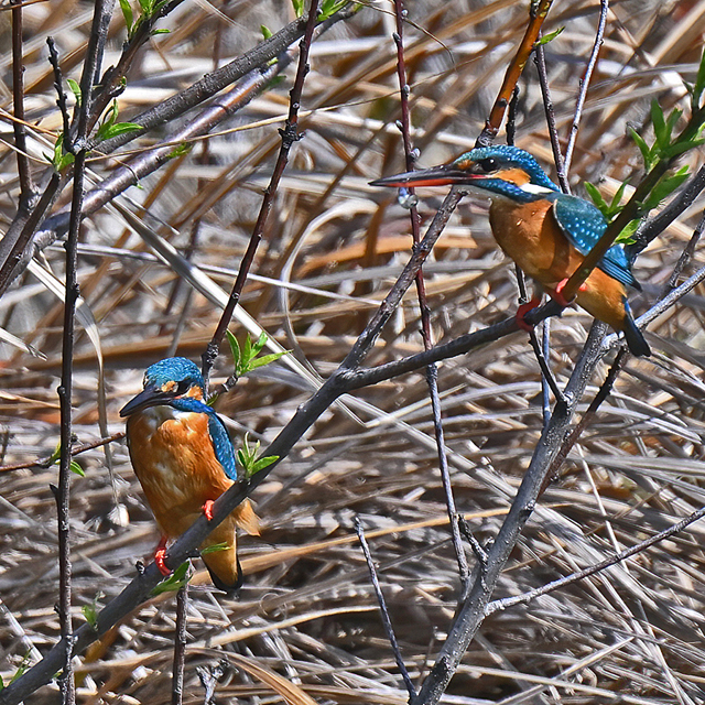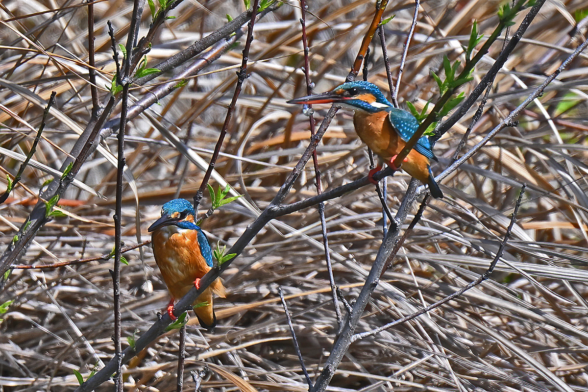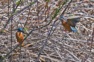 | 員弁川付近の用水路にて。 2月27日に♂♀がペアになっての活動を始めたカワセミ。 今日も♂の個体が♀待ちのポジションにおり、そこを 放置して時間が経過してから再び来てみると、ペアに なって留まっていました。♂はじっと動かず、♀がその まわりを動き回ってから去って行きました。 |