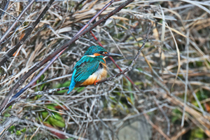 | 員弁川付近の用水路。 カワセミ♂がいましたが、少しの物音や人・車の気配で飛び去ってしまうような 警戒心をもつようになってきました。1〜2月に4mの距離でも動じなかったのが うそのようになりました。繁殖期のせいなのでしょうか。 この水路で、婚姻色になった美しいアオサギがゆっくりと飛び立ちました。 足が赤く、嘴がピンク・オレンジ、冠羽や背中に飾り羽などの特徴が見られ ますが、何よりも美しいのは目先のブルー! よくわかるようにトリミングを しました。歌舞伎、もしくは新羅の花郎(ファラン)の化粧のように華やか。 人工的でなくまったく自然にこんなに色変化するのが素晴らしいです。 |