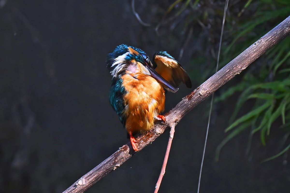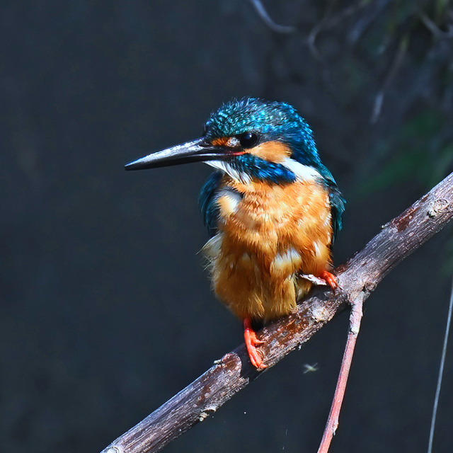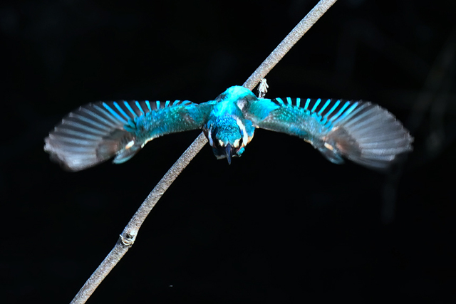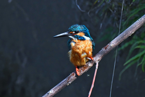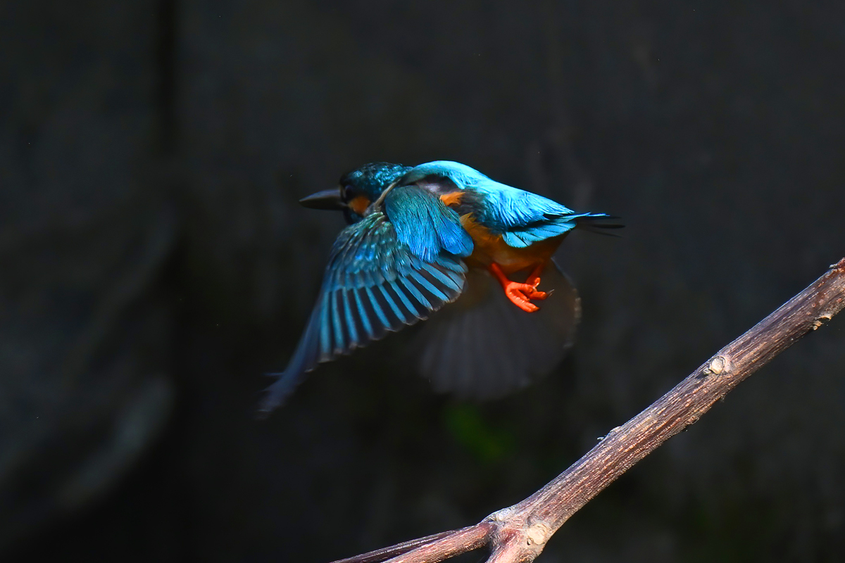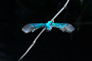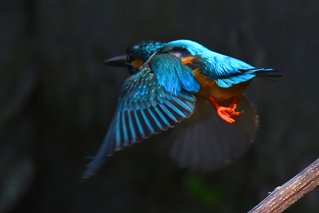 | 背景が日陰でスポットライトを 受けたようなカワセミの活動。 |
