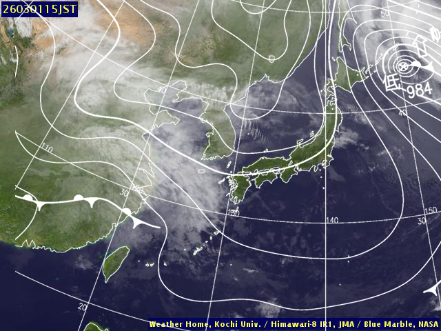 | 地上(高知大学気象情報頁赤外画像と気象庁速報天気図を合成) | |||