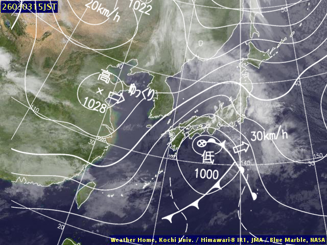 | 地上(高知大学気象情報頁赤外画像と気象庁速報天気図を合成) | |||