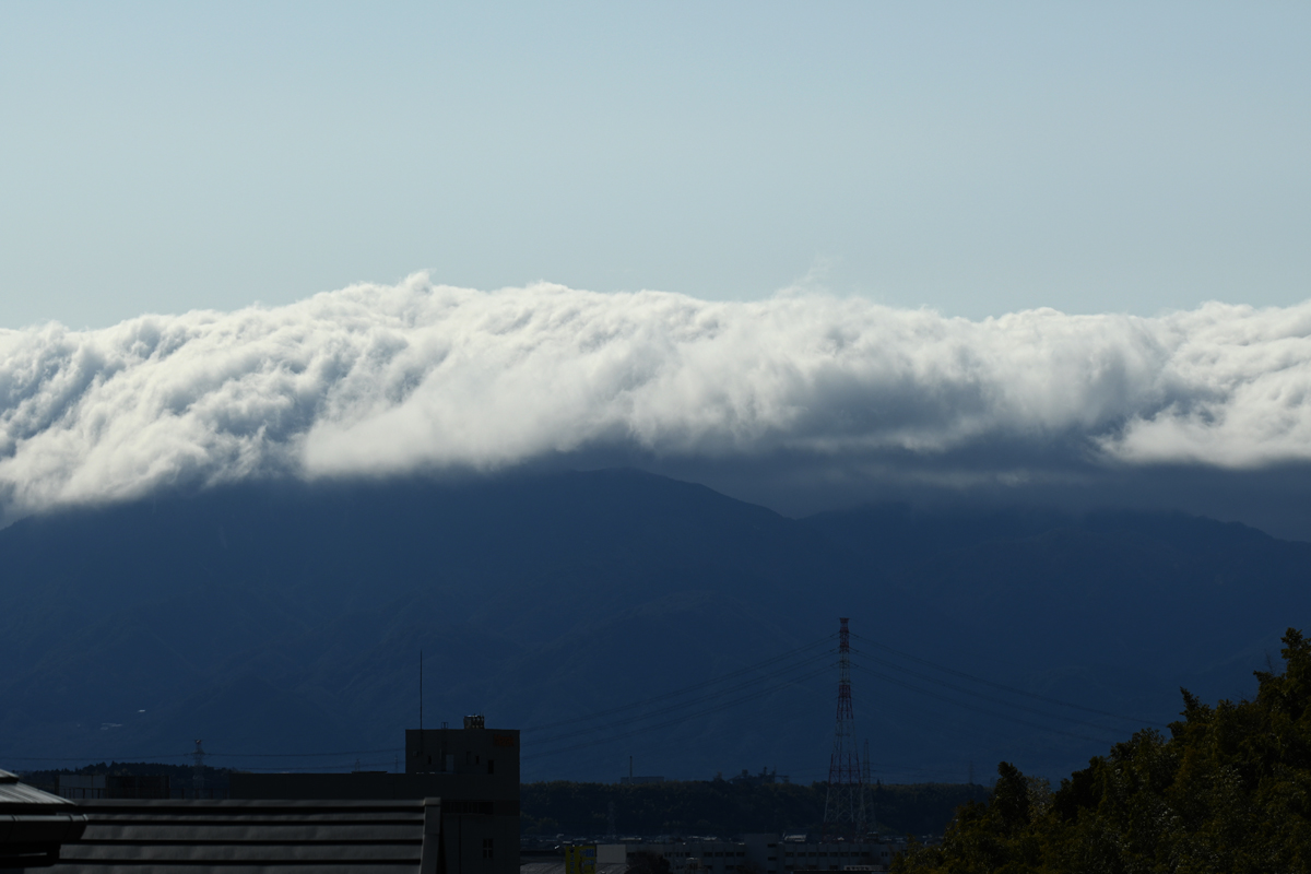 | ゆるやかに北寄りの風が吹く快晴。 鈴鹿山脈に被さる、いわゆる「風枕」の雲だけが、白々と輝いていました。 夕方、ふと気づくと、山脈に沿う細長いつるし雲や、彩雲を生じる薄い レンズ雲が湧き出すように生じていました。(分類的にはどれもレンズ雲) 雲の種類としては高積雲のレンズ雲になりますが、やがて東に延伸する ように高積雲・巻積雲として広がりを見せていきました。 これらのタイプの雲は、中層に西風が卓越するとき、鈴鹿山脈を超える 気流がその風下に生じて、「気流は流れ続けているが、同じ場所に 雲を生じさせ続ける」ものです。この地域のひとつの大きな特徴です。 |