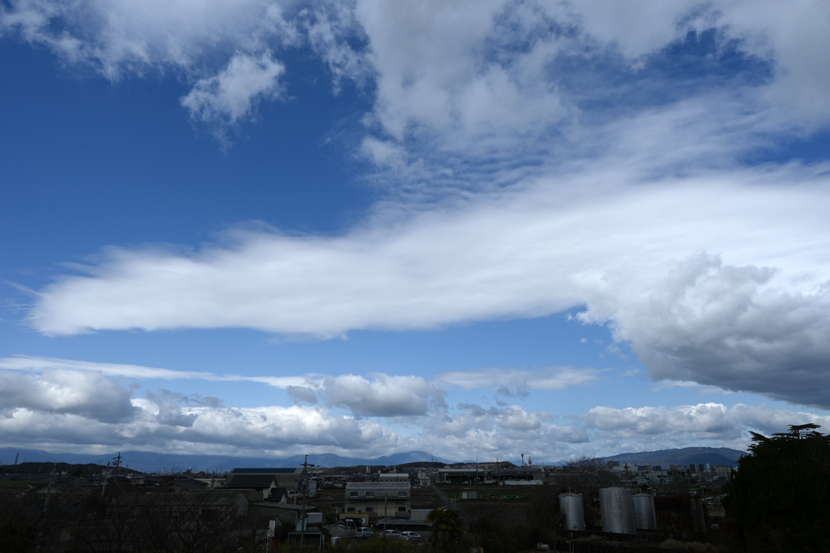 | 昨日の昼過ぎに降り出した雨は朝まで継続。 未明には寒冷前線が通過しました。 今日の日中は強い北西風が吹き、しばしば突風に。 晴れ上がる空には、つるし雲があちらこちらに見えてきました。 |
