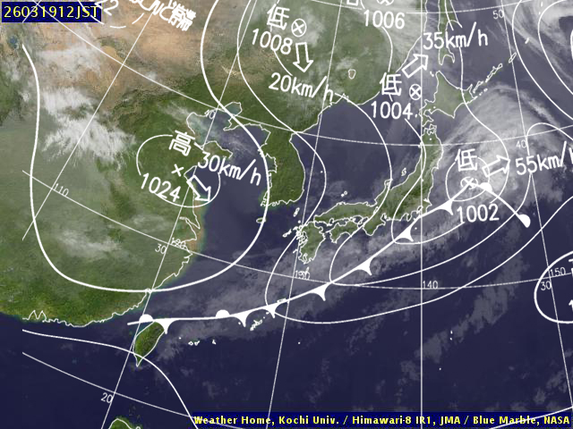 | 地上(高知大学気象情報頁赤外画像と気象庁速報天気図を合成) | |||