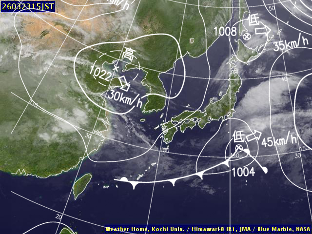 | 地上(高知大学気象情報頁赤外画像と気象庁速報天気図を合成) | |||