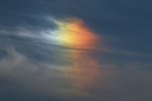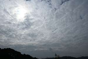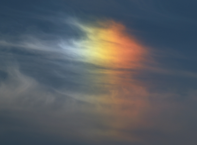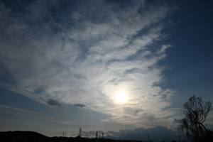 | 南岸に発生した低気圧は小雨をもたらし、三重県北部では 朝には天気が回復して、層積雲が広がりました。 午後になると冷たい北西風が吹いて、地形性の雲が発生。 さらには夕方、上層雲(飛行機由来を含む)が多く流れてきて 巻雲の肋骨雲なども見られました。 また、ハロはなく、幻日も淡いものが少しだけという巻層雲が 続いていましたが、日没の30分ほど前に太陽の両側に明るい 幻日があらわれ、特に太陽の左側のものはかなり鮮やかなに 輝きました。(ふつうの)望遠レンズを持ち合わせず、野鳥撮影中 だったので、その500mmレンズを使って拡大撮影を行いました。 |